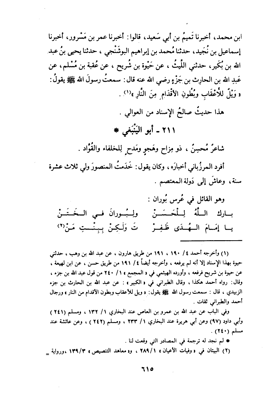 (1) وأخرجه أحمد 4 / 190، 191 من طريق هارون، عن عبد الله بن وهب، حدثني حيوة بهذا الإسناد إلا أنه لم يرفعه، وأخرجه أيضا 4 / 191 من طريق حسن، عن ابن لهيعة، عن حيوة بن شريح فرفعه، وأورده الهيثمي في " المجمع " 1 / 240 من قول عبد الله بن جزء، وقال: رواه أحمد هكذا، وقال الطبراني في " الكبير ": عن عبد الله بن الحارث بن جزء الزبيدي، قال: سمعت رسول الله صلى الله عليه وسلم يقول: " ويل للاعقاب وبطون الاقدام من النار " ورجال أحمد والطبراني ثقات.