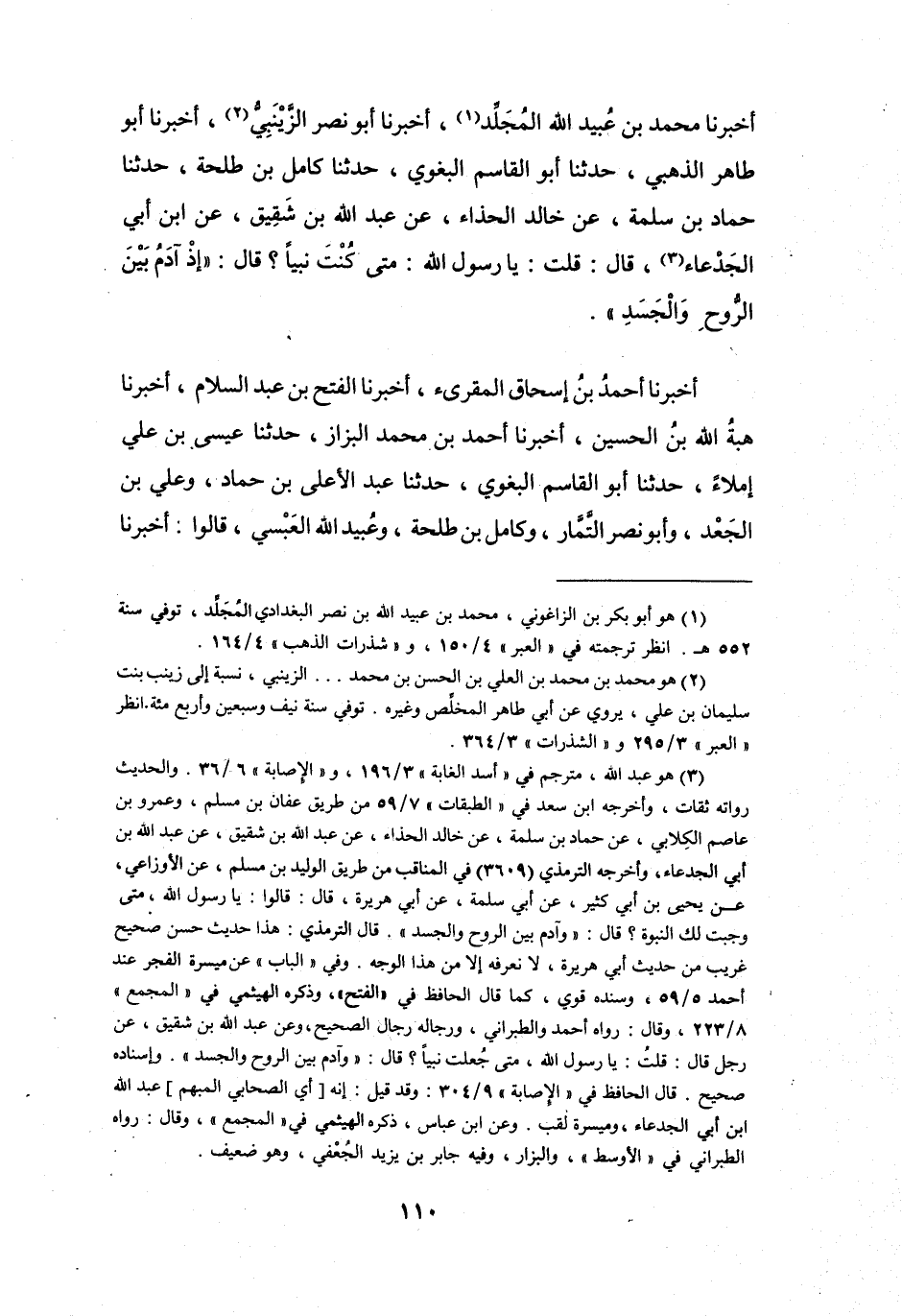 أَخْبَرَنَا مُحَمَّدُ بنُ عُبَيْدِ اللهِ المُجَلِّدُ (1) ، أَخْبَرَنَا أَبُو نَصْرٍ الزَّيْنَبِيُّ (2) ، أَخْبَرَنَا أَبُو طَاهِرٍ الذَّهَبِيُّ، حَدَّثَنَا أَبُو القَاسِمِ البَغَوِيُّ، حَدَّثَنَا كَامِلُ بنُ طَلْحَةَ، حَدَّثَنَا حَمَّادُ بنُ سَلَمَةَ، عَنْ خَالِدٍ الحَذَّاءِ، عَنْ عَبْدِ اللهِ بنِ شَقِيْقٍ، عَنِ ابْنِ أَبِي الجَدْعَاءِ (3) ، قَالَ: