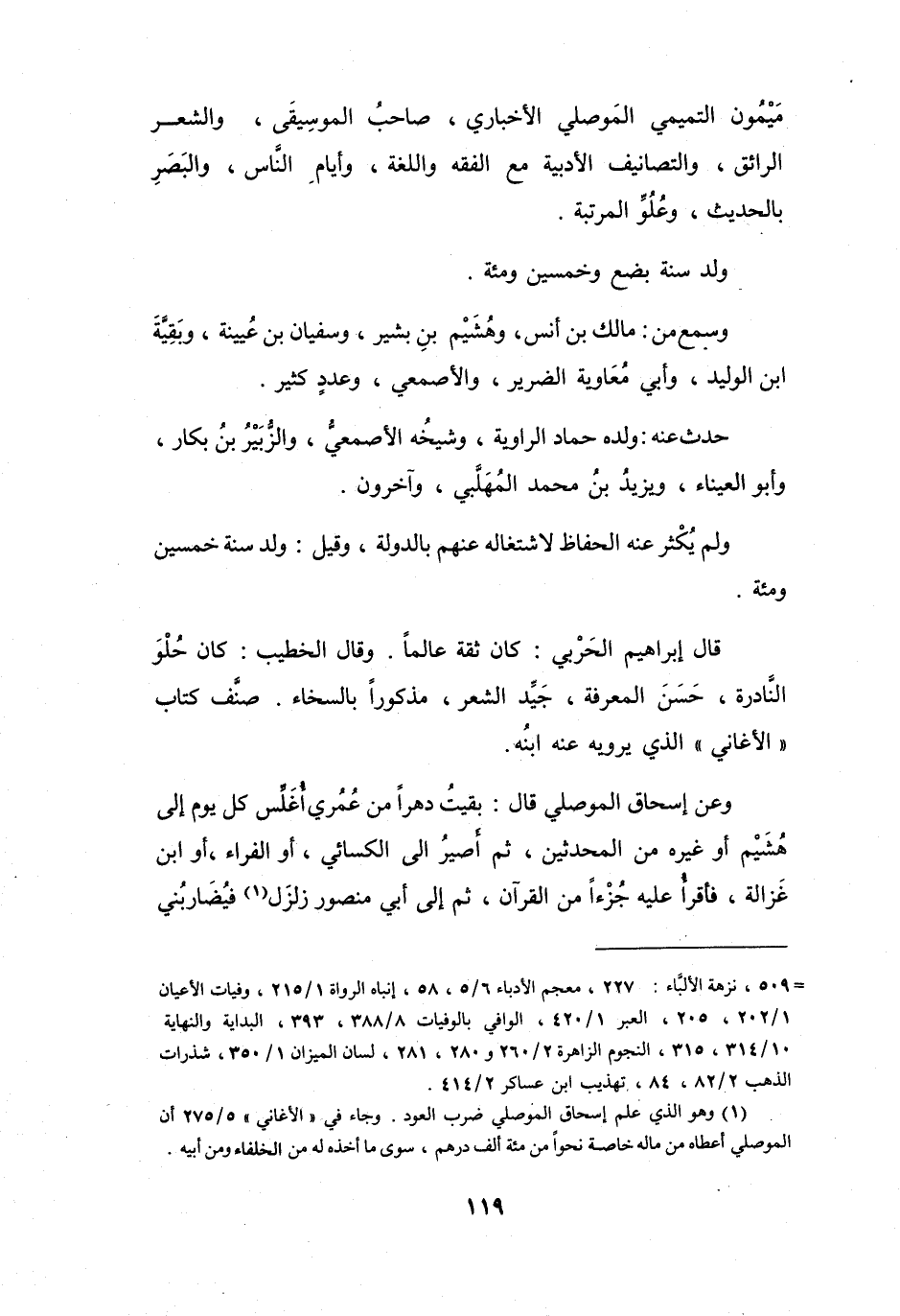 (1) وهو الذي علم إسحاق الموصلي ضرب العود. وجاء في " الاغاني " 5 / 275 أن الموصلي أعطاه من ماله خاصة نحوا من مئة ألف درهم، سوى ما أخذه له من الخلفاء ومن أبيه.