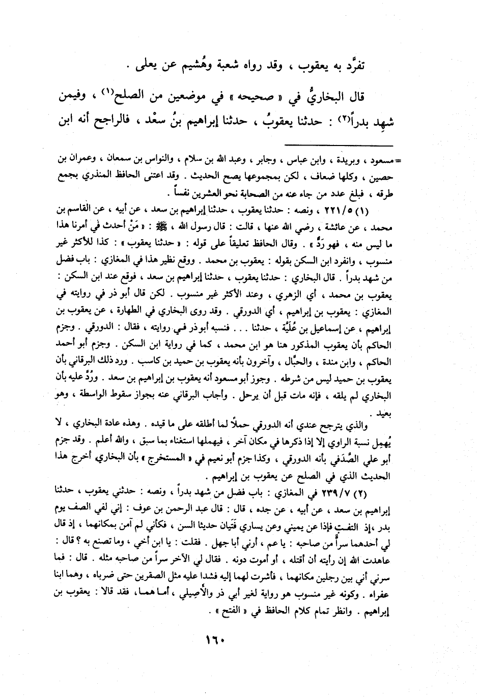 قَالَ البُخَارِيُّ: فِي (صَحِيْحِهِ) فِي مَوْضِعَينِ مِنَ الصُّلحِ (1) ، وَفِيْمَنْ شَهِدَ بَدراً (2) : حَدَّثَنَا يَعْقُوْبُ، حَدَّثَنَا إِبْرَاهِيْمُ بنُ سَعْدٍ، فَالرَّاجِحُ أَنَّهُ ابْنُ