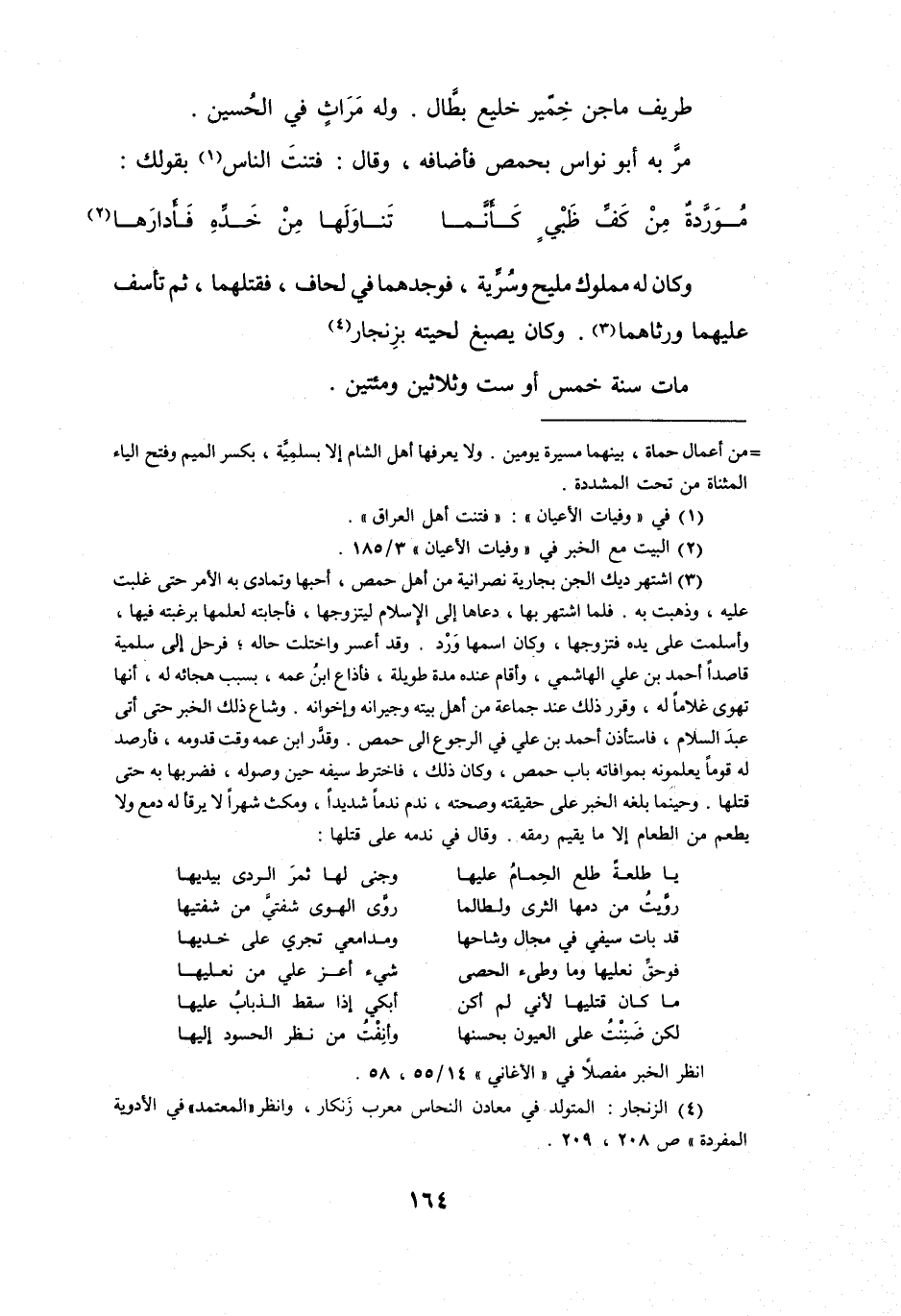 وَكَانَ لَهُ مَمْلُوْكٌ مَلِيْحٌ، وَسُرِّيَّةٌ، فَوَجَدَهَمَا فِي لِحَافٍ، فَقَتَلَهُمَا، ثُمَّ تَأَسَّفَ عَلَيْهِمَا، وَرَثَاهُمَا (3) ، وَكَانَ يَصْبِغُ لِحْيَتَهُ بِزِنْجَارٍ (4) .