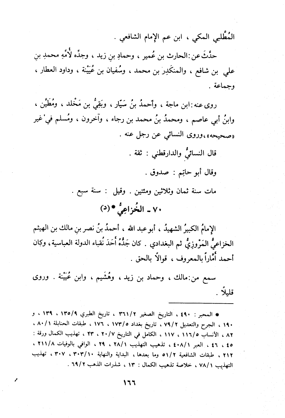 (*) المحبر: 490، التاريخ الصغير 2 / 361، تاريخ الطبري 9 / 135، 139، و190، الجرح والتعديل 2 / 79، تاريخ بغداد 5 / 173، 176، طبقات الحنابلة 1 / 80، 82، الأنساب 5 / 116، 117، الكامل في التاريخ 7 / 20، 23، تهذيب الكمال ورقة: 45، 46، العبر 1 / 408، تذهيب التهذيب 1 / 28، 29، الوافي بالوفيات 8 / 211، 212، طبقات الشافعية 2 / 51 وما بعدها، البداية والنهاية 10 / 303، 307، تهذيب التهذيب 1 / 78، خلاصة تذهيب الكمال: 13، شذرات الذهب 2 / 69.