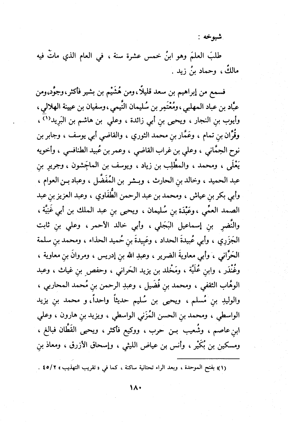 وَمَرْوَانَ بنِ مُعَاوِيَةَ، وَغُنْدَرٍ، وَابْنِ عُلَيَّةَ، وَمَخْلَدِ بنِ يَزِيْدَ الحَرَّانِيِّ، وَحَفْصِ بنِ غِيَاثٍ، وَعَبْدِ الوَهَّابِ الثَّقَفِيِّ، وَمُحَمَّدِ بنِ فُضَيْلٍ، وَعَبْدِ الرَّحْمَنِ بنِ مُحَمَّدٍ المُحَارِبِيِّ، وَالوَلِيْدِ بنِ مُسْلِمٍ، وَيَحْيَى بنِ سُلَيْمٍ - حَدِيْثاً وَاحِداً - وَمُحَمَّدِ بنِ يَزِيْدَ الوَاسِطِيِّ، وَمُحَمَّدِ بنِ الحَسَنِ المُزَنِيِّ الوَاسِطِيِّ.