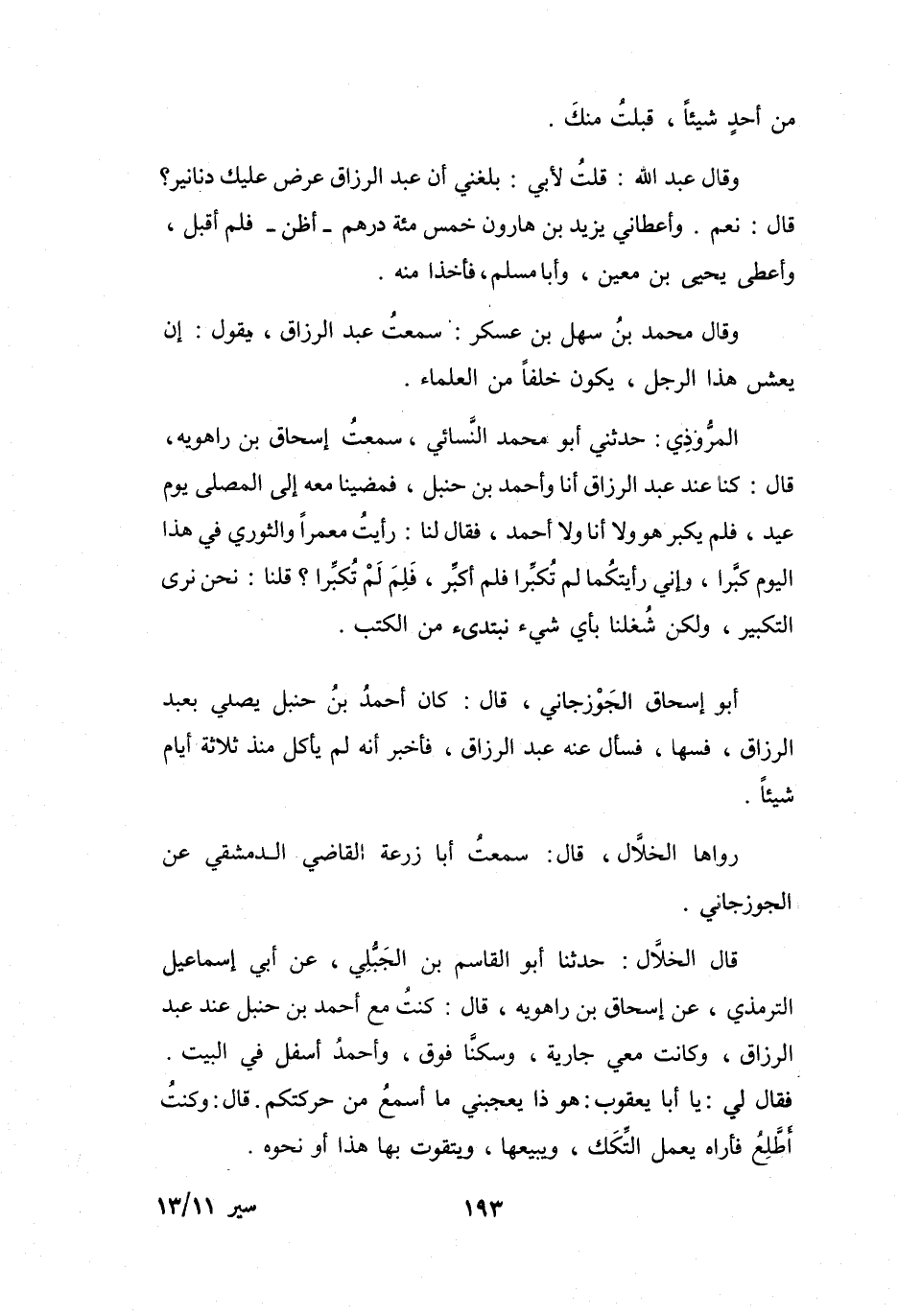 كُنْتُ مَعَ أَحْمَدَ بنِ حَنْبَلٍ عِنْدَ عَبْدِ الرَّزَّاقِ، وَكَانَتْ مَعِي جَارِيَةٌ، وَسَكَنَّا فَوْقُ، وَأَحْمَدُ أَسْفَلُ فِي البَيْتِ.