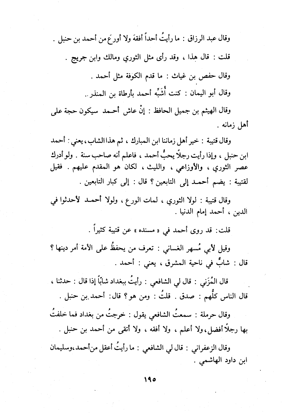 خَرَجتُ مِنْ بَغْدَادَ، فَمَا خَلَّفتُ بِهَا رَجُلاً أَفْضَلَ، وَلاَ أَعْلَمَ، وَلاَ أَفْقَهَ، وَلاَ أَتْقَى مِنْ أَحْمَدَ بنِ حَنْبَلٍ.