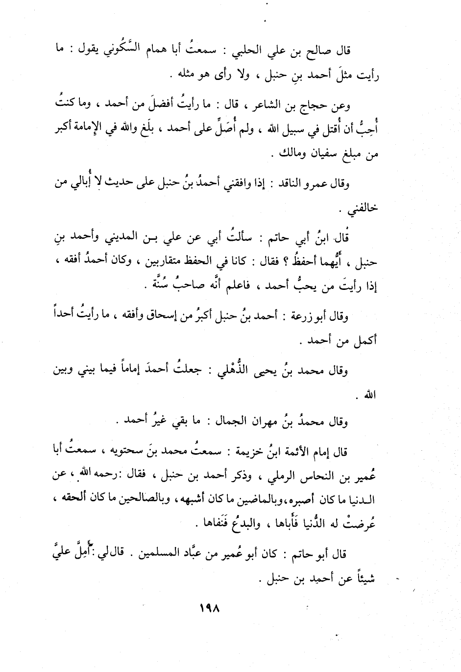 وَعَنْ حَجَّاجِ بنِ الشَّاعِرِ، قَالَ: مَا رَأَيْتُ أَفْضَلَ مِنْ أَحْمَدَ، وَمَا كُنْتُ أُحِبُّ أَن أُقتَلَ فِي سَبِيْلِ اللهِ وَلَمْ أُصَلِّ عَلَى أَحْمَدَ، بلَغَ -وَاللهِ- فِي الإِمَامَةِ أَكْبَرَ مِنْ مَبْلَغِ سُفْيَانَ وَمَالِكٍ.