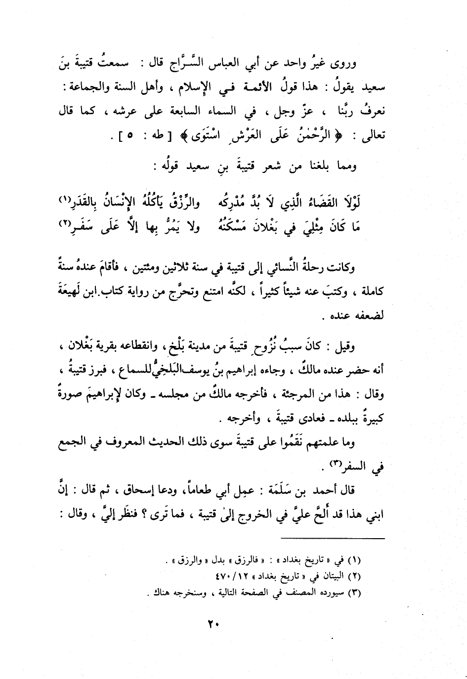 سَمِعْتُ قُتَيْبَةَ بنَ سَعِيْدٍ يَقُوْلُ: هَذَا قَوْلُ الأَئِمَّةِ فِي الإِسْلاَمِ وَأَهْلُ السُّنَّةِ وَالجَمَاعَةِ: نَعرِفُ رَبَّنَا -عَزَّ وَجَلَّ- فِي السَّمَاءِ السَّابِعَةِ عَلَى عَرْشِهِ، كَمَا قَالَ تَعَالَى: {الرَّحْمَنُ عَلَى العَرْشِ اسْتَوَى} [طه: 5] .