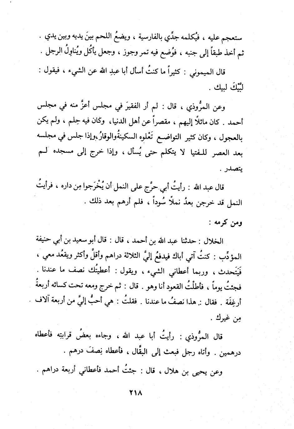 قَالَ المَرُّوْذِيُّ: رَأَيْتُ أَبَا عَبْدِ اللهِ، وَجَاءهُ بَعْضُ قَرَابَتِه، فَأَعطَاهُ دِرْهَمَيْنِ، وَأَتَاهُ رَجُلٌ، فَبَعَثَ إِلَى البَقَّالِ، فَأَعطَاهُ نِصْفَ دِرْهَمٍ.