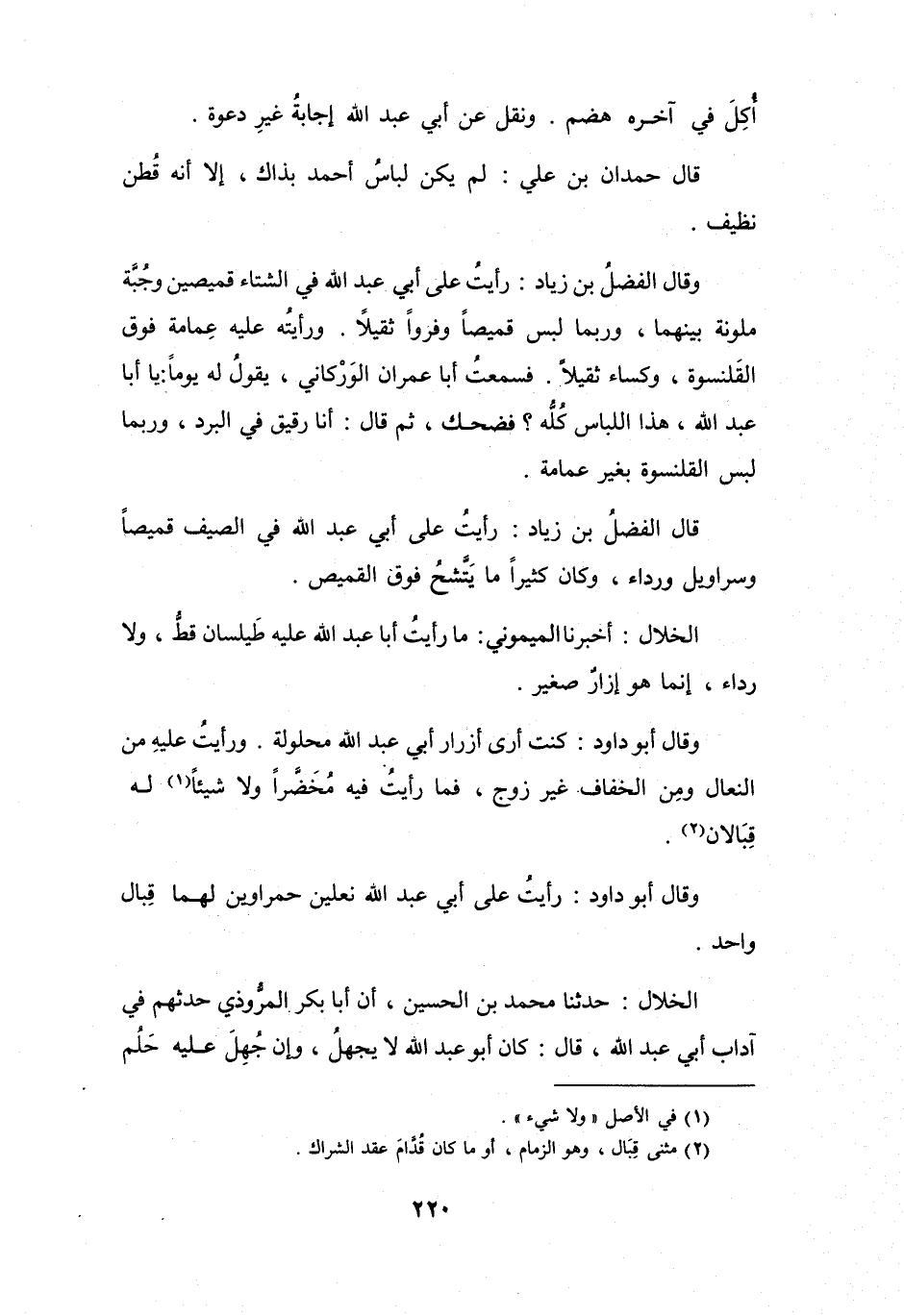 وَقَالَ أَبُو دَاوُدَ: كُنْتُ أَرَى أَزرَارَ أَبِي عَبْدِ اللهِ مَحلُولَةً، وَرَأَيْتُ عَلَيْهِ مِنَ النِّعَالِ وَمِنَ الخِفَافِ غَيْرَ زَوجٍ، فَمَا رَأَيْتُ فِيْهِ مُخَضَّراً وَلاَ شَيْئاً (1) لَهُ قِبَالاَنِ (2) .