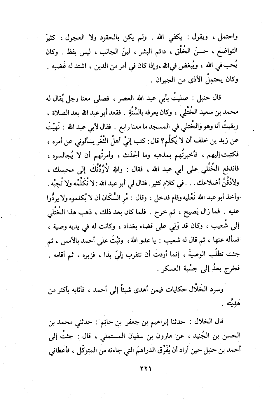 قَالَ حَنْبَلٌ: صَلَّيْتُ بِأَبِي عَبْدِ اللهِ العَصرَ، فَصَلَّى مَعَنَا رَجُلٌ يُقَالُ لَهُ: مُحَمَّدُ بنُ سَعِيْدٍ الخُتَّلِيُّ، وَكَانَ يَعْرِفُه بِالسُّنَّةِ، فَقَعَدَ أَبُو عَبْدِ اللهِ بَعْدَ الصَّلاَةِ، وَبقيتُ أَنَا وَهُوَ وَالخُتَّلِيُّ فِي المَسْجَدِ مَا مَعَنَا رَابِعٌ، فَقَالَ لأَبِي عَبْدِ اللهِ: نَهيْتَ عَنْ زَيْدِ بنِ خَلَفٍ أَنْ لاَ يُكَلِّمَ؟