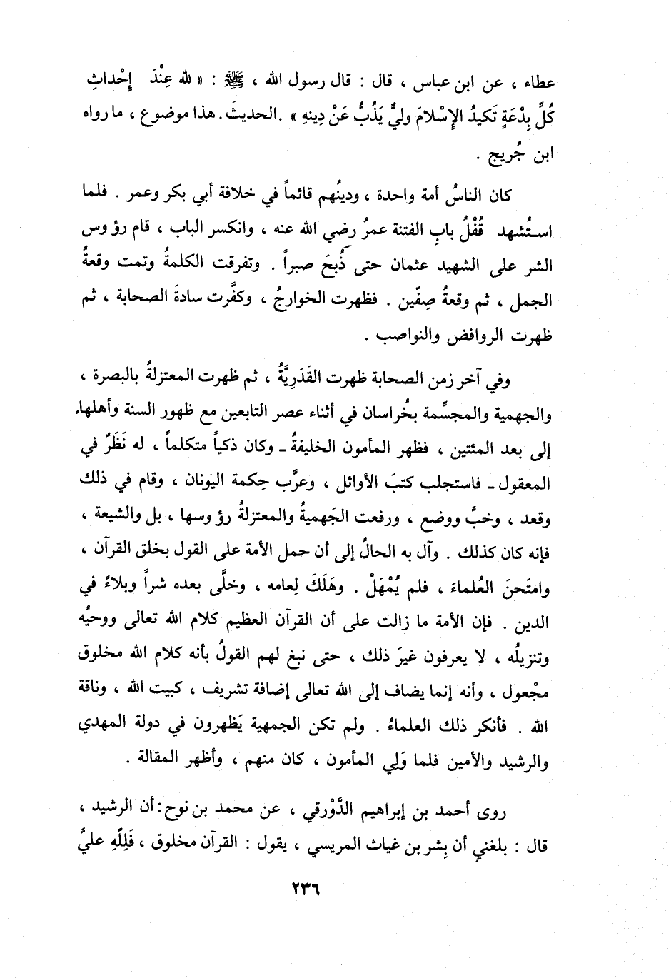 وَفِي آخِرِ زَمَنِ الصَّحَابَةِ ظَهرتِ القَدَرِيَّةُ، ثُمَّ ظَهرتِ المُعْتَزِلَةُ بِالبَصْرَةِ، وَالجَهْمِيَّةُ وَالمُجَسِّمَةُ بِخُرَاسَانَ فِي أَثْنَاء عَصرِ التَّابِعِيْنَ مَعَ ظُهورِ السُّنَّةِ وَأَهْلِهَا إِلَى بَعْدِ المائَتَيْنِ، فَظَهَرَ المَأْمُوْنُ الخَلِيْفَةُ - وَكَانَ ذَكِيّاً مُتَكَلِّماً، لَهُ نَظَرٌ فِي المَعْقُوْلِ - فَاسْتجلَبَ كُتبَ الأوَائِلِ، وَعَرَّبَ حِكمَةَ اليُونَانِ، وَقَامَ فِي ذَلِكَ وَقَعَدَ، وَخَبَّ وَوَضَعَ، وَرَفَعَتِ الجَهْمِيَّةُ وَالمُعْتَزِلَةُ رُؤُوْسَهَا، بَلْ وَالشِّيْعَةُ، فَإنَّهُ كَانَ كَذَلِكَ.