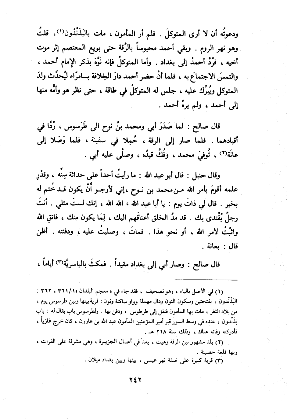 (1) في الأصل بالباء، وهو تصحيف، فقد جاء في " معجم البلدان " 1 / 361، 362: البذندون، بفتحتين وسكون النون ودال مهملة وواو ساكنة ونون: قرية بينها وبين طرسوس يوم، من بلاد الثغر، مات بها المأمون فنقل إلى طرطوس، ودفن بها.