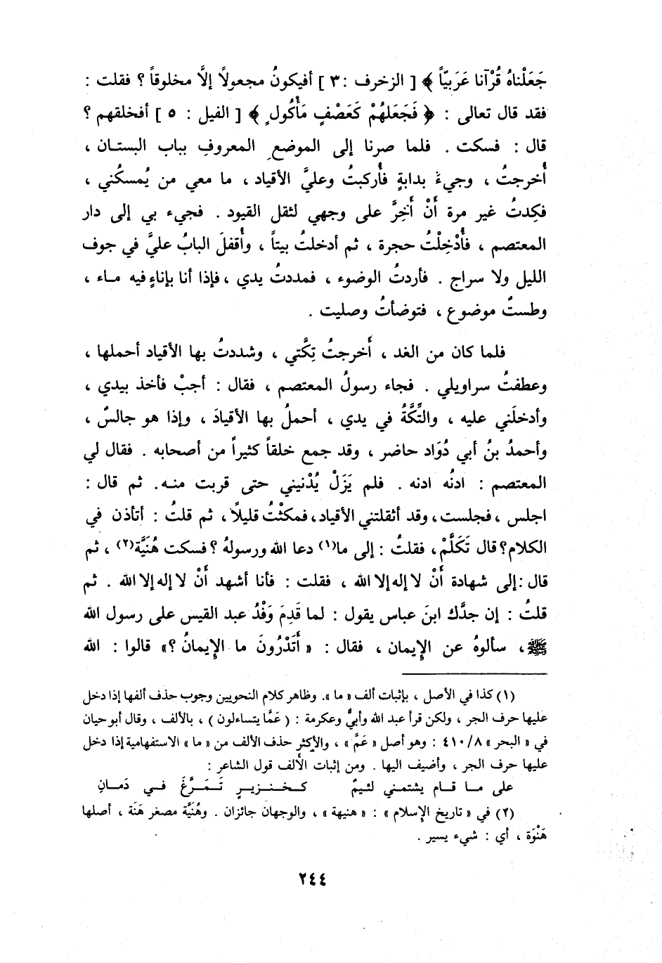 فَلَمَّا صِرنَا إِلَى المَوْضِعِ المَعْرُوْفِ بِبَابِ البُسْتَانِ، أُخرجتُ، وَجيءَ بدَابَّةٍ، فَأُرْكبتُ وَعَلَيَّ الأَقيَادُ، مَا مَعِي مَنْ يُمْسِكُنِي، فَكِدتُ غَيْرَ مَرَّةٍ أَنْ أَخِرَّ عَلَى وَجْهِي لِثِقَلِ القُيودِ.