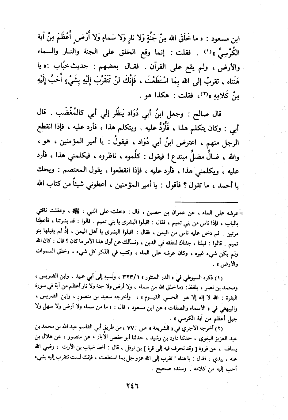 (2) أخرجه الآجري في " الشريعة " ص: 77، من طريق أبي القاسم عبد الله بن محمد بن عبد العزيز البغوي، حدثنا داود بن رشيد، حدثنا أبو حفص الابار، عن منصور، عن هلال بن يساف، عن فروة (وقد تحرف فيه إلى قرة) بن نوفل، قال: أخذ خباب بن الارت، رضي الله عنه، بيدي، فقال: يا هناه! تقرب إلى الله عزوجل بما استطعت، فإنك لست تتقرب إليه بشيء أحب إليه من كلامه.