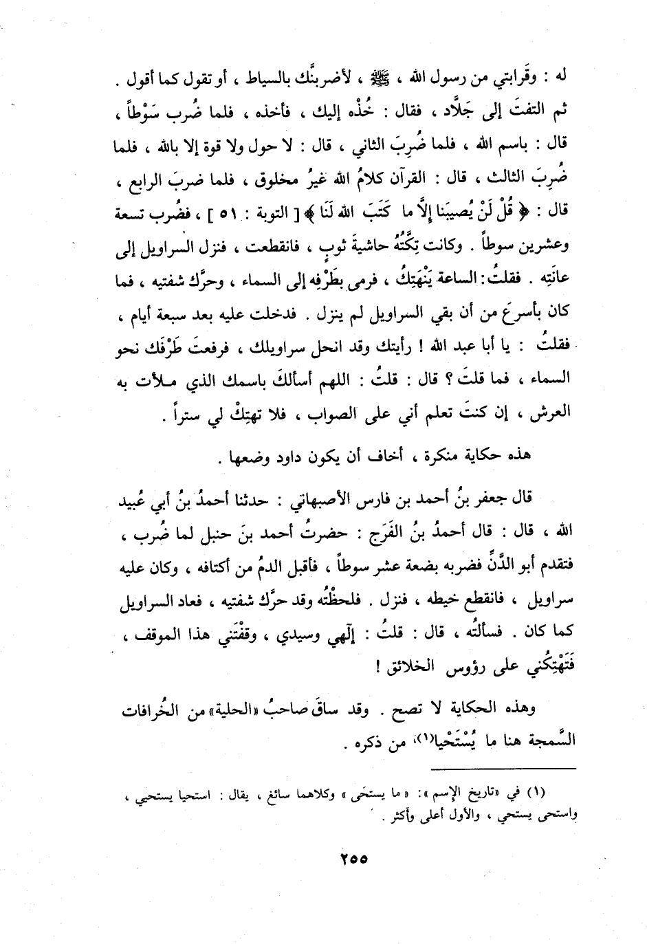 قَالَ أَحْمَدُ بنُ الفَرَجِ: حضَرتُ أَحْمَدَ بنَ حَنْبَلٍ لَمَّا ضُرِبَ، فَتَقَدَّمَ أَبُو الدَّنِّ فَضربَهُ بِضْعةَ عَشرَ سَوطاً، فَأَقبلَ الدَّمُ مِنْ أكتَافِهِ، وَكَانَ عَلَيْهِ سَرَاويلُ، فَانقطَعَ خَيطُهُ، فَنَزَلَ.