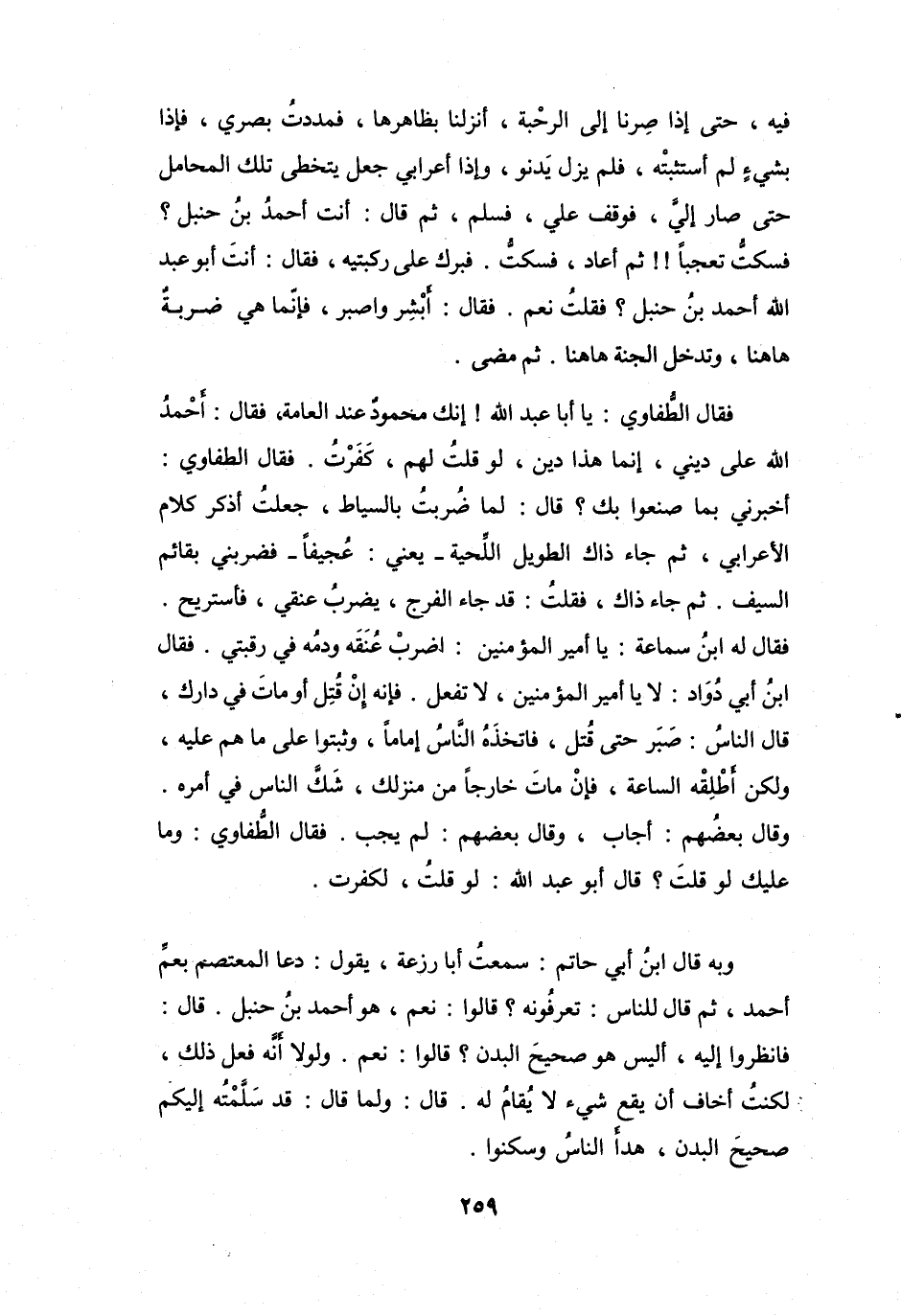 فِيْهِ، حَتَّى إِذَا صِرنَا إِلَى الرَّحبَةِ، أُنزِلنَا بِظَاهِرهَا، فمددتُ بَصَرِي، فَإذَا بِشَيْءٍ لَمْ أَسْتثبتْه، فَلَمْ يَزَلْ يدنُو، وَإِذَا أَعْرَابِيٌّ جَعَلَ يَتخطَّى تِلْكَ المَحَاملَ حَتَّى صَارَ إِلَيَّ، فَوَقَفَ عَليَّ، فَسَلَّمَ، ثُمَّ قَالَ: أَنْتَ أَحْمَدُ بنُ حَنْبَلٍ؟
