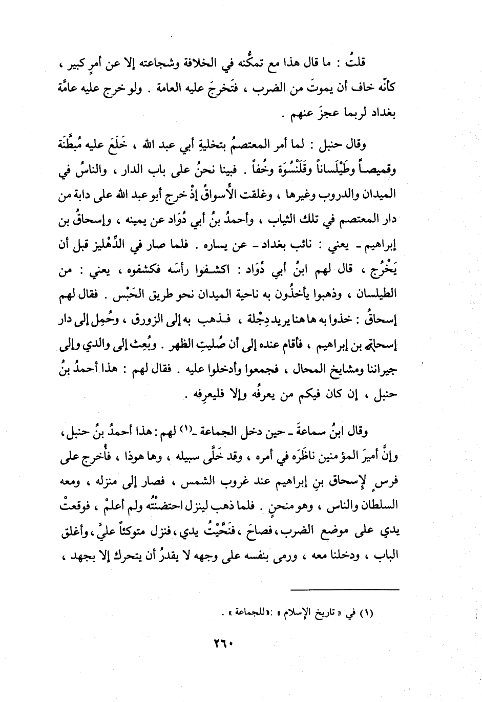 فَبَينَا نَحْنُ عَلَى بَابِ الدَّارِ، وَالنَّاسُ فِي المَيدَانِ وَالدُّروبِ وَغَيْرِهَا، وَغُلَّقتِ الأسواقُ، إِذ خَرَجَ أَبُو عَبْدِ اللهِ عَلَى دَابَّةٍ مِنْ دَارِ المُعْتَصِمِ فِي تِلْكَ الثِّيَابِ، وَأَحْمَدُ بنُ أَبِي دُوَادَ عَنْ يَمِيْنِهِ، وَإِسْحَاقُ بنُ إِبْرَاهِيْمَ -يَعْنِي: نَائِبَ بَغْدَادَ- عَنْ يسَارِهِ.