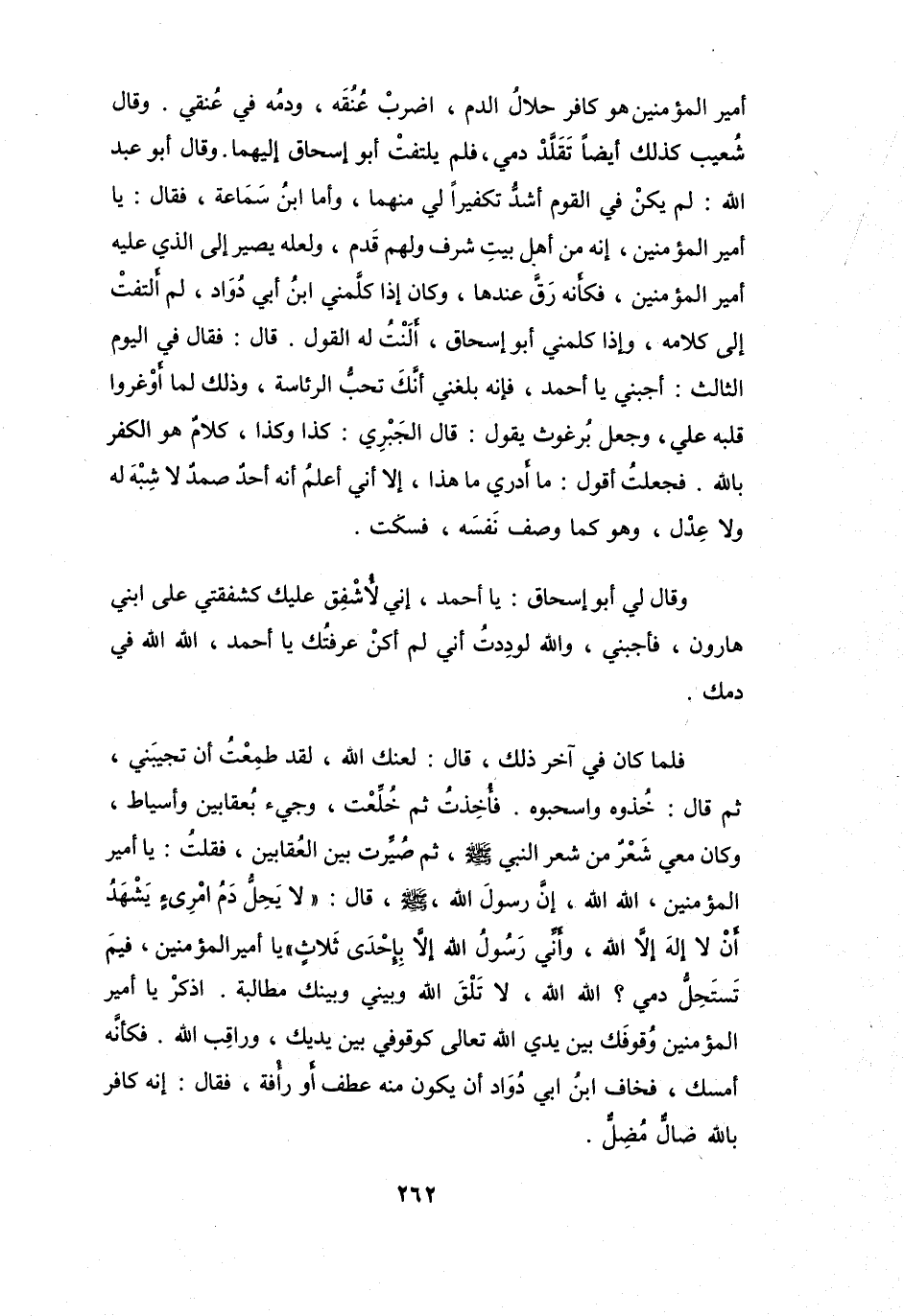 فَأُخذتُ ثُمَّ خُلِّعتُ، وَجِيْءَ بِعُقَابَيْنِ وَأَسيَاطٍ، وَكَانَ مَعِي شعرٌ مِنْ شعرِ النَّبِيِّ -صَلَّى اللَّهُ عَلَيْهِ وَسَلَّمَ- ثُمَّ صُيِّرتُ بَيْنَ العُقَابينِ، فَقُلْتُ: يَا أَمِيْرَ المُؤْمِنِيْنَ، اللهَ اللهَ، إِنَّ رَسُوْلَ اللهِ -صَلَّى اللَّهُ عَلَيْهِ وَسَلَّمَ- قَالَ: (لاَ يَحِلُّ دَمُ امْرِئٍ يَشْهَدُ أَنْ لاَ إِلَهَ إِلاَّ اللهُ وَأَنِّي رَسُوْلُ اللهِ إِلاَّ بِإِحْدَى ثَلاَثٍ) ، يَا أَمِيْرَ المُؤْمِنِيْنَ، فِيمَ تَسْتحلُّ دَمِي؟ اللهَ اللهَ، لاَ تَلقَ اللهَ وَبَيْنِي وَبَيْنَكَ مُطَالَبَةٌ، اذكرْ يَا أَمِيْرَ المُؤْمِنِيْنَ وُقُوفَك بَيْنَ يَدَيِ اللهِ -تَعَالَى- كَوقُوفِي بَيْن يَدَيكَ، وَرَاقبِ اللهَ.
