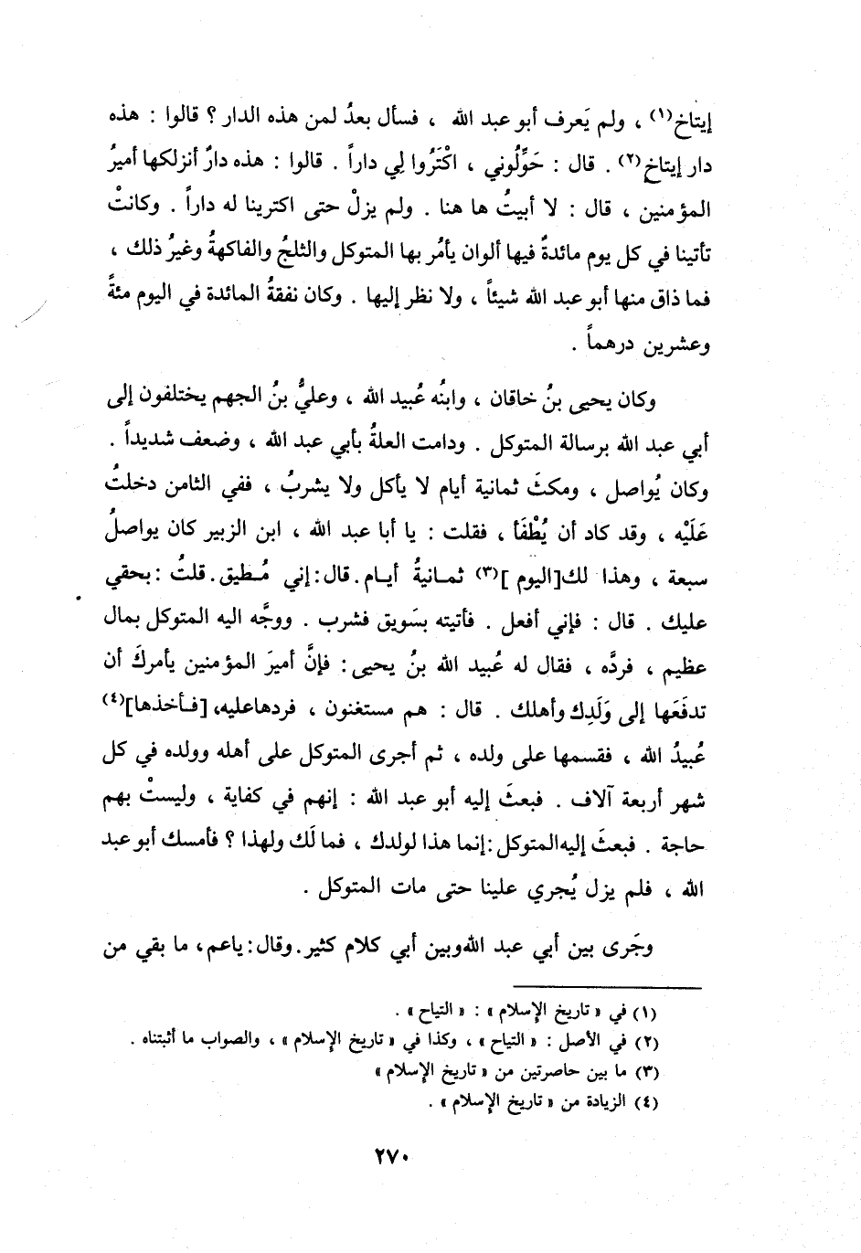 وَكَانَ يَحْيَى بنُ خَاقَانَ، وَابْنُهُ عُبَيْدُ اللهِ، وَعَلِيُّ بنُ الجَهْمِ يَخْتَلِفُوْنَ إِلَى أَبِي عَبْدِ اللهِ بِرِسَالَةِ المُتَوَكِّلِ، وَدَامتِ العِلَّةُ بِأَبِي عَبْدِ اللهِ، وَضَعُفَ شَدِيْداً.