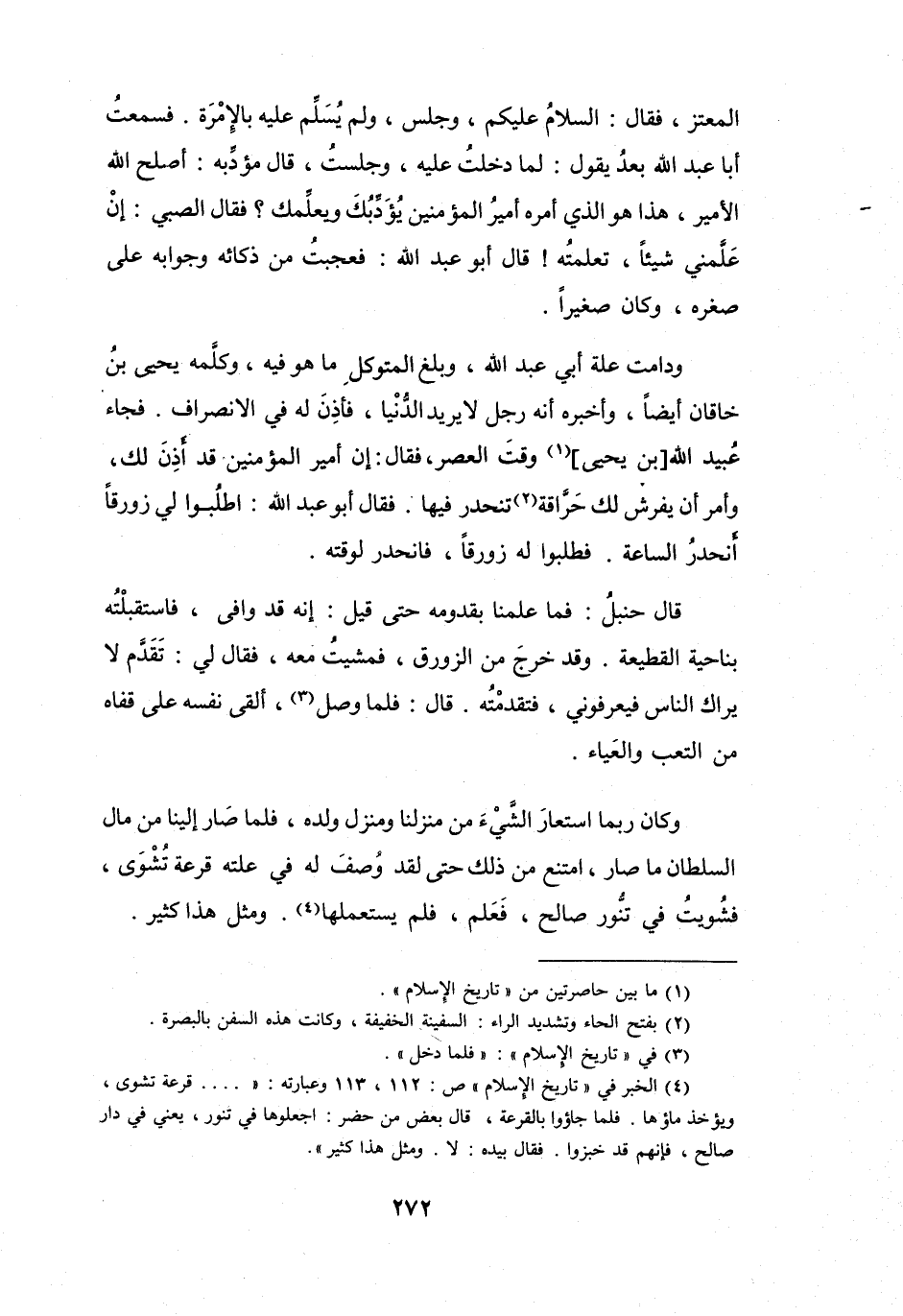 وَدَامَتْ عِلَّةُ أَبِي عَبْدِ اللهِ، وَبَلَغَ المُتَوَكِّلَ مَا هُوَ فِيْهِ، وَكَلَّمَهُ يَحْيَى بنُ خَاقَانَ أَيْضاً، وَأَخْبَرَهُ أَنَّهُ رَجُلٌ لاَ يُرِيْدُ الدُّنْيَا، فَأَذِنَ لَهُ فِي الانْصِرَافِ، فَجَاءَ عُبَيْدُ اللهِ بنُ يَحْيَى (1) وَقْتَ العَصْرِ، فَقَالَ: إِنَّ أَمِيْرَ المُؤْمِنِيْنَ قَدْ أَذِنَ لَكَ، وَأَمَرَ أَنْ يَفْرُشَ لَكَ حَرَّاقَةً (2) تَنْحَدِرُ فِيْهَا.
