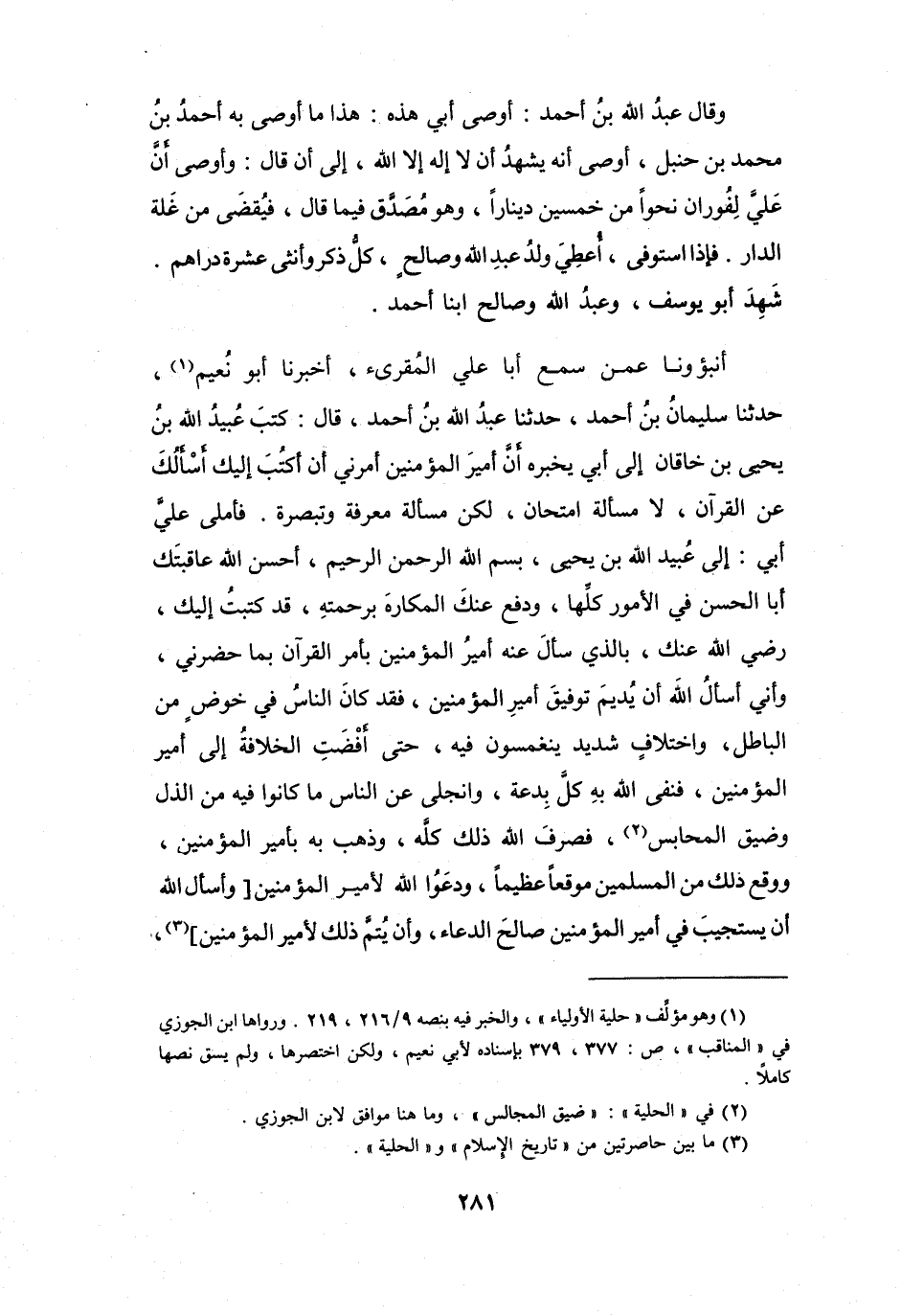 هَذَا مَا أَوْصَى بِهِ أَحْمَدُ بنُ مُحَمَّدِ بنِ حَنْبَلٍ، أَوْصَى أَنَّهُ يَشْهَدُ أَنْ لاَ إِله إِلاَّ اللهَ، إِلَى أَنْ قَالَ: