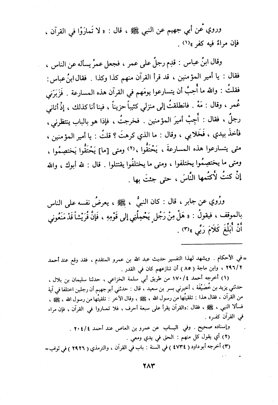 (1) أخرجه أحمد 4 / 170 من طريق أبي سلمة الخزاعي، حدثنا سليمان بن بلال، حدثني يزيد بن خصيفة، أخبرني بسر بن سعيد، قال: حدثني أبو جهيم أن رجلين اختلفا في آية من القرآن، فقال هذا: تلقيتها من رسول الله، صلى الله عليه وسلم، وقال الآخر: تلقيتها من رسول الله، صلى الله عليه وسلم، فسألا النبي، صلى الله عليه وسلم، فقال: " القرآن يقرأ على سبعة أحرف، فلا تماروا في القرآن، فإن مراء في القرآن كفر ". وإسناده صحيح.