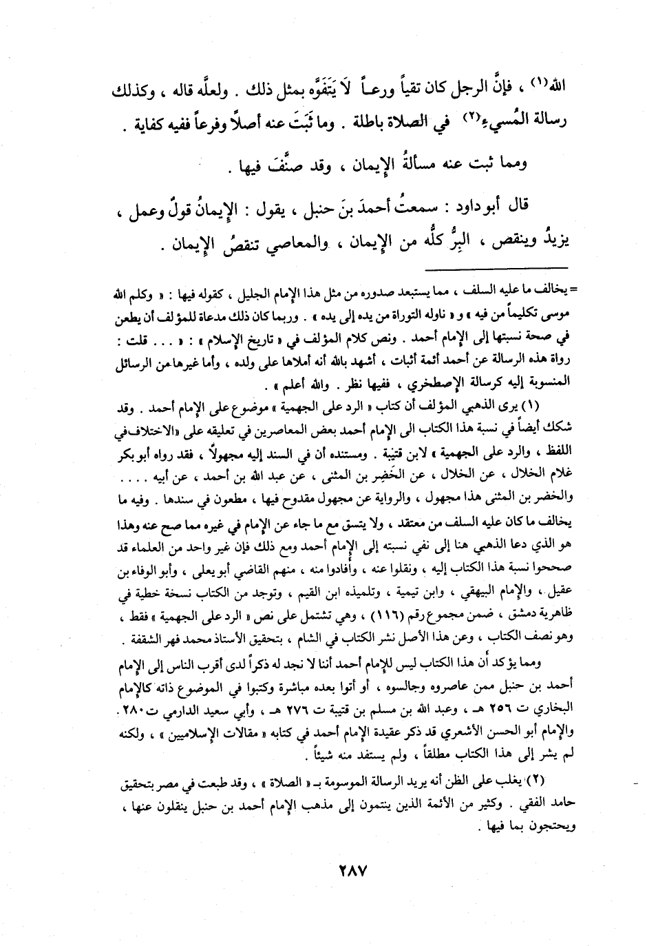 ونص كلام المؤلف في " تاريخ الإسلام ": " ... قلت: رواة هذه الرسالة عن أحمد أئمة أثبات، أشهد بالله أنه أملاها على ولده، وأما غيرها من الرسائل المنسوبة إليه كرسالة الاصطخري، ففيها نظر.