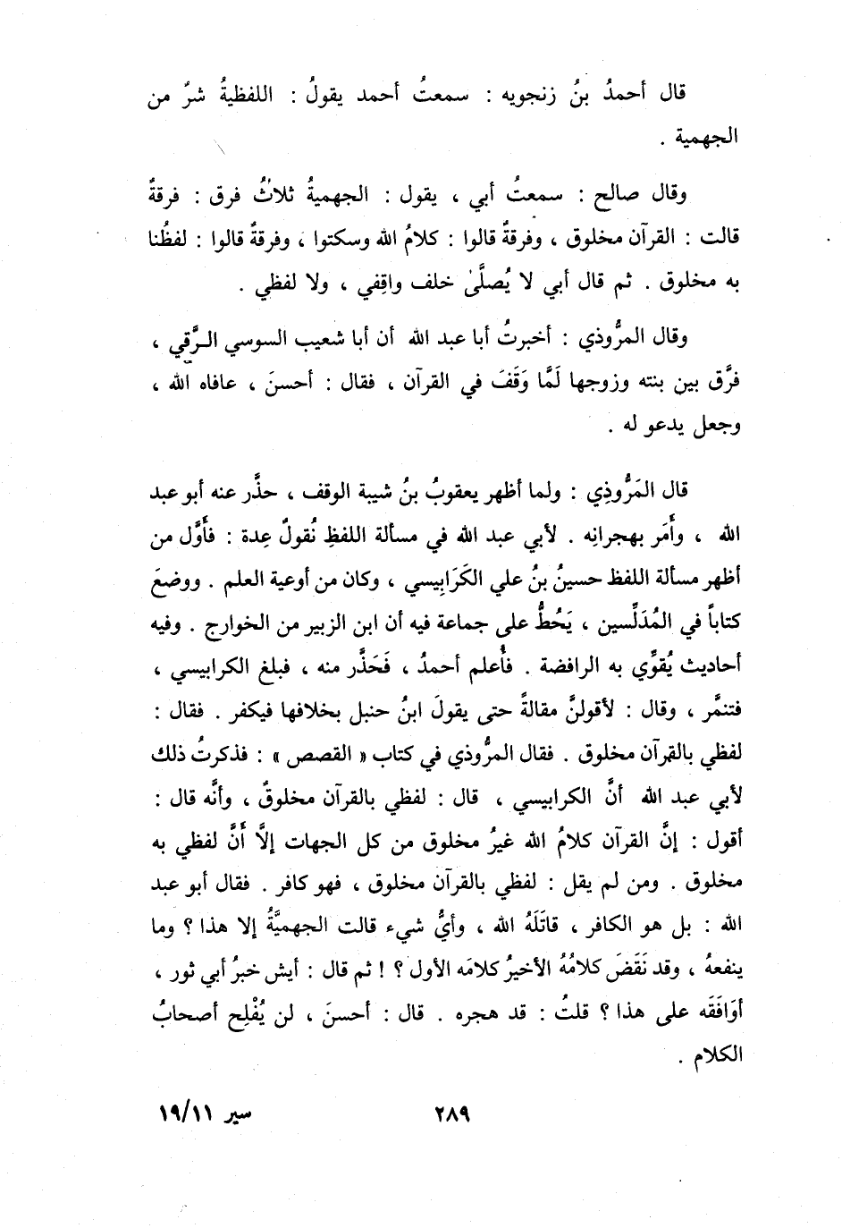 لأَبِي عَبْدِ اللهِ فِي مَسْأَلَةِ اللَّفْظِ نُقُوْلٌ عِدَّةٌ: فَأَوَّلُ مَنْ أَظْهَرَ مَسْأَلَةَ اللَّفْظِ حُسَيْنُ بنُ عَلِيٍّ الكَرَابِيْسِيُّ، وَكَانَ مِنْ أَوْعِيَةِ العِلْمِ، وَوَضَعَ كِتَاباً فِي المُدَلِّسِينَ، يَحُطُّ عَلَى جَمَاعَةٍ: فِيْهِ أَنَّ ابْنَ الزُّبَيْرِ مِنَ الخَوَارِجِ.