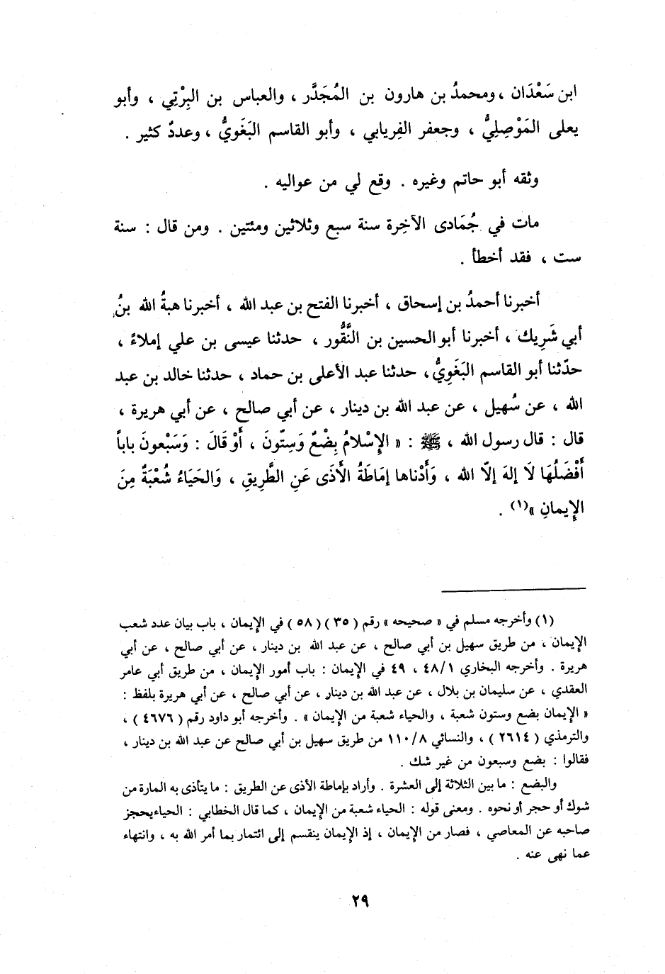 وأخرجه البخاري 1 / 48، 49 في الايمان: باب أمور الايمان، من طريق أبي عامر العقدي، عن سليمان بن بلال، عن عبد الله بن دينار، عن أبي صالح، عن أبي هريرة بلفظ: " الايمان بضع وستون شعبة، والحياء شعبة من الايمان ".