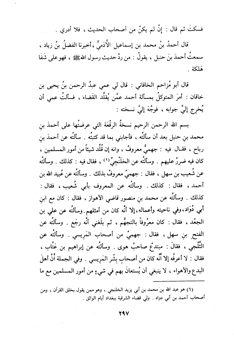 بِسْمِ اللهِ الرَّحْمَنِ الرَّحِيْمِ، نُسْخَةُ الرُّقْعَةِ الَّتِي عرضتُهَا عَلَى أَحْمَدَ بنِ مُحَمَّدِ بنِ حَنْبَلٍ بَعْدَ أَنْ سَأَلْتُهُ، فَأجَابنِي بِمَا قَدْ كَتَبْتُهُ.