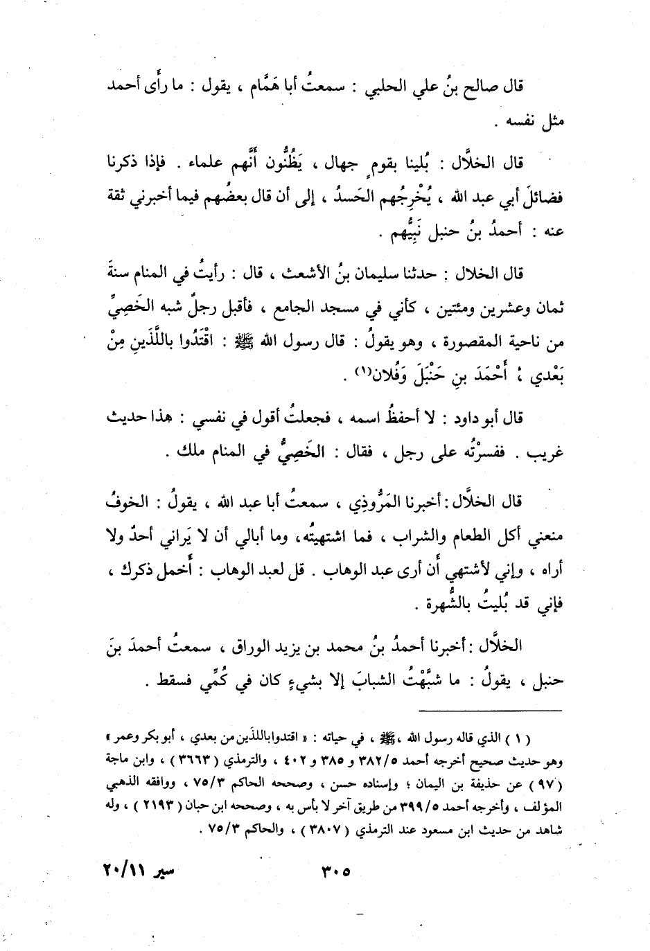 قَالَ الخَلاَّلُ: بُلينَا بِقَومٍ جُهَّالٍ، يَظُنُّونَ أَنَّهُم عُلَمَاءُ، فَإذَا ذَكرنَا فَضَائِلَ أَبِي عَبْدِ اللهِ، يُخْرِجُهُمُ الحَسدُ إِلَى أَنْ قَالَ بَعْضُهُمْ فِيْمَا أَخْبَرَنِي ثِقَةٌ عَنْهُ: أَحْمَدُ بنُ حَنْبَلٍ نَبِيُّهُم.