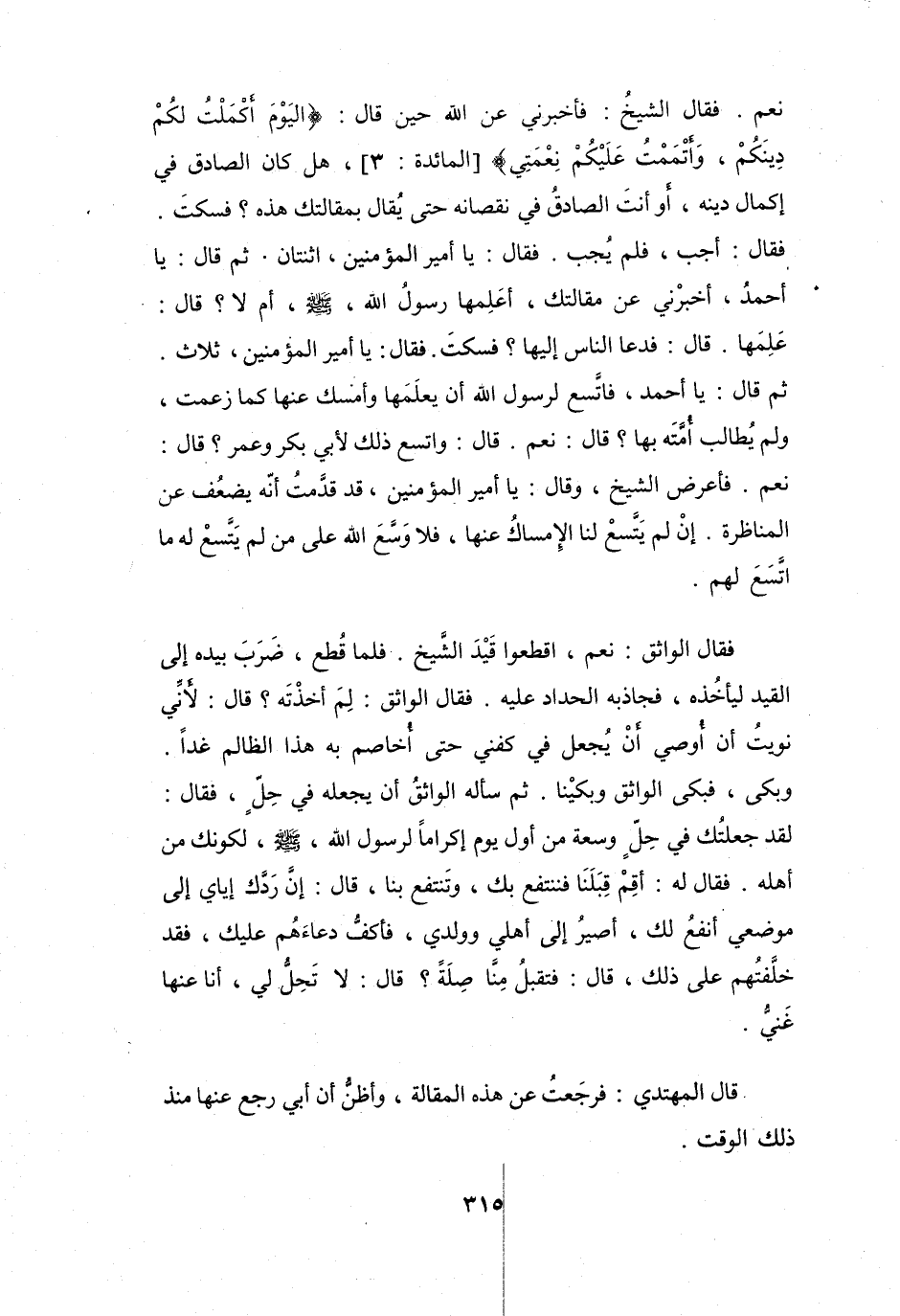فَأَعرضَ الشَّيْخُ، وَقَالَ: يَا أَمِيْرَ المُؤْمِنِيْنَ، قَدْ قَدَّمْتُ أَنَّهُ يَضْعُفُ عَنِ المُنَاظَرَةِ، إِنْ لَمْ يَتَّسعْ لَنَا الإِمسَاكُ عَنْهَا، فَلاَ وَسَّعَ اللهُ عَلَى مَنْ لَمْ يَتَّسعْ لَهُ مَا اتَّسَعَ لَهُم.