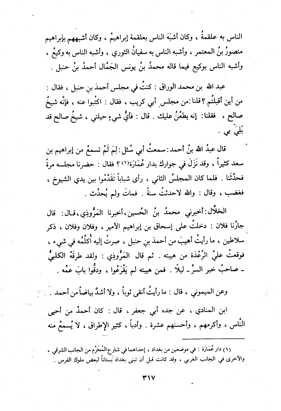 عَبْدُ اللهِ بنُ مُحَمَّدٍ الوَرَّاقُ: كُنْتُ فِي مَجْلِسِ أَحْمَدَ بنِ حَنْبَلٍ، فَقَالَ: مِنْ أَيْنَ أَقبَلتُم؟