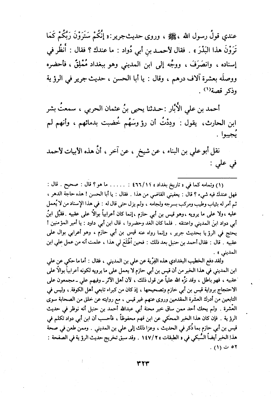 وَانْصَرَفَ، وَوَجَّهَ إِلَى ابْنِ المَدِيْنِيِّ وَهُوَ بِبَغْدَادَ مُمْلِقٌ، فَأَحضَرَهُ، وَوَصَلَهُ بِعَشْرَةِ آلاَفِ دِرْهَمٍ، وَقَالَ: يَا أَبَا الحَسَنِ، حَدِيْثُ جَرِيْرٍ فِي الرُّؤْيَةِ، وَذَكَرَ قِصَّةً (1) .