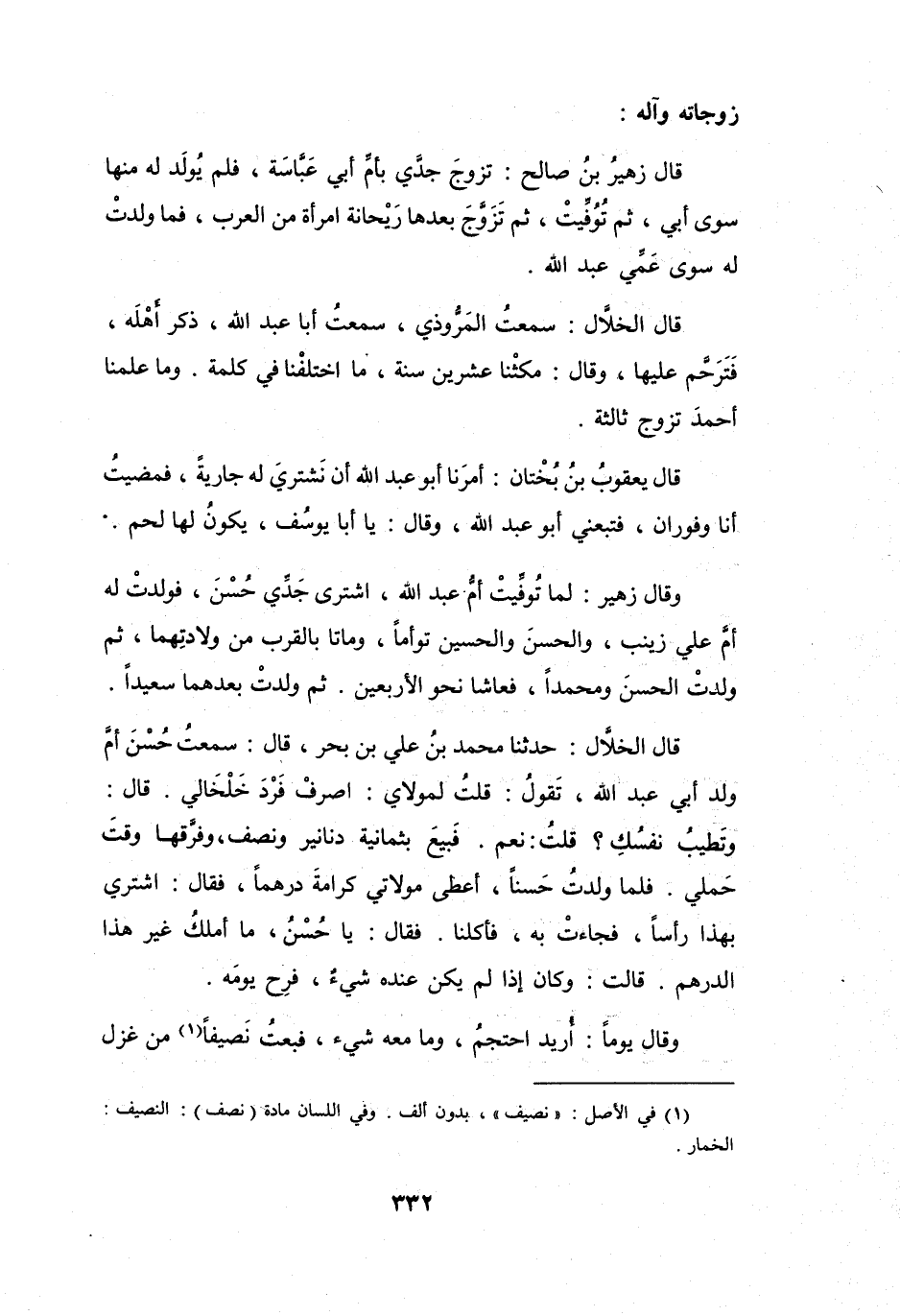 وَقَالَ زُهَيْرٌ: لَمَّا تُوُفِّيَتْ أُمُّ عَبْدِ اللهِ، اشْتَرَى جَدِّي حُسْنَ، فَوَلَدَتْ لَهُ أُمَّ عَلِيٍّ زَيْنَبَ، وَالحَسَنَ وَالحُسَيْنَ تَوْأَماً، وَمَاتَا بِالقُربِ مِنْ وِلاَدَتِهِمَا، ثُمَّ وَلَدَتِ الحَسَنَ وَمُحَمَّداً، فَعَاشَا نَحْوَ الأَرْبَعِيْنَ، ثُمَّ وَلَدَتْ بَعْدَهُمَا سَعِيْداً.