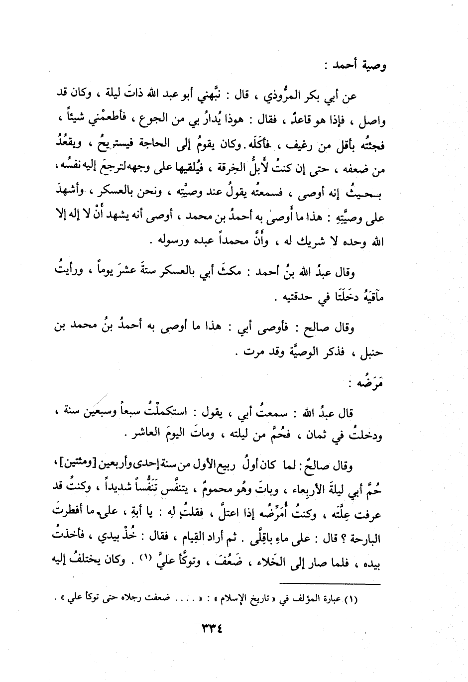 وَكَانَ يَقُومُ إِلَى الحَاجَةِ فَيَستَرِيحُ، وَيَقَعُدُ مِنْ ضَعفِهِ، حَتَّى إِنْ كُنْتُ لأَبُلُّ الخِرقَةَ، فَيُلقِيهَا عَلَى وَجْهِهِ لِتَرجِعَ إِلَيْهِ نَفْسُهُ بِحَيْثُ إِنَّهُ أَوْصَى، فَسَمِعْتُهُ يَقُوْلُ عِنْدَ وَصِيَّتِهِ - نَحْنُ بِالعَسْكَرِ - وَأَشهَدَ عَلَى وَصِيَّتِهِ: