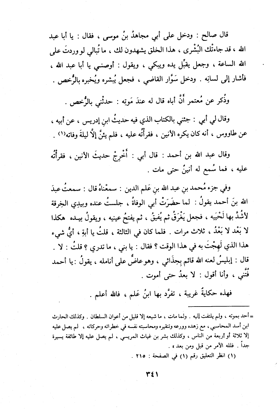 وكذلك الحارث ابن أسد المحاسبي، مع زهده وورعه وتنقيره ومحاسبته نفسه في خطراته وحركاته، لم يصل عليه إلا ثلاثة أو أربعة من الناس، وكذلك بشر بن غياث المريسي، لم يصل عليه إلا طائفة يسيرة جدا. فلله الامر من قبل ومن بعد ".