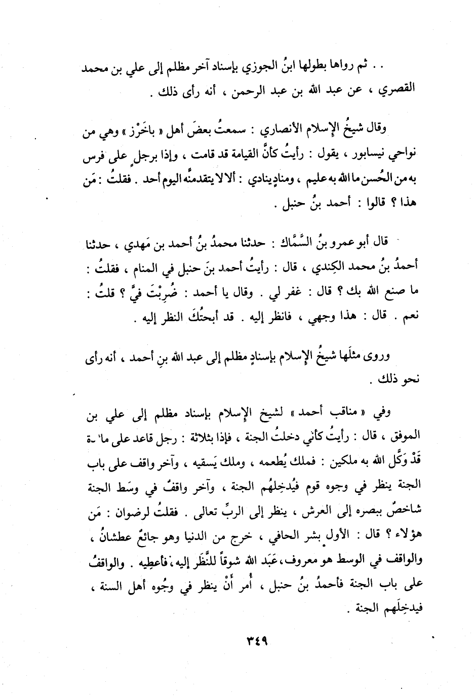 رَأَيْتُ أَحْمَدَ بنَ حَنْبَلٍ فِي المَنَامِ، فَقُلْتُ: مَا صَنَعَ اللهُ بِكَ؟