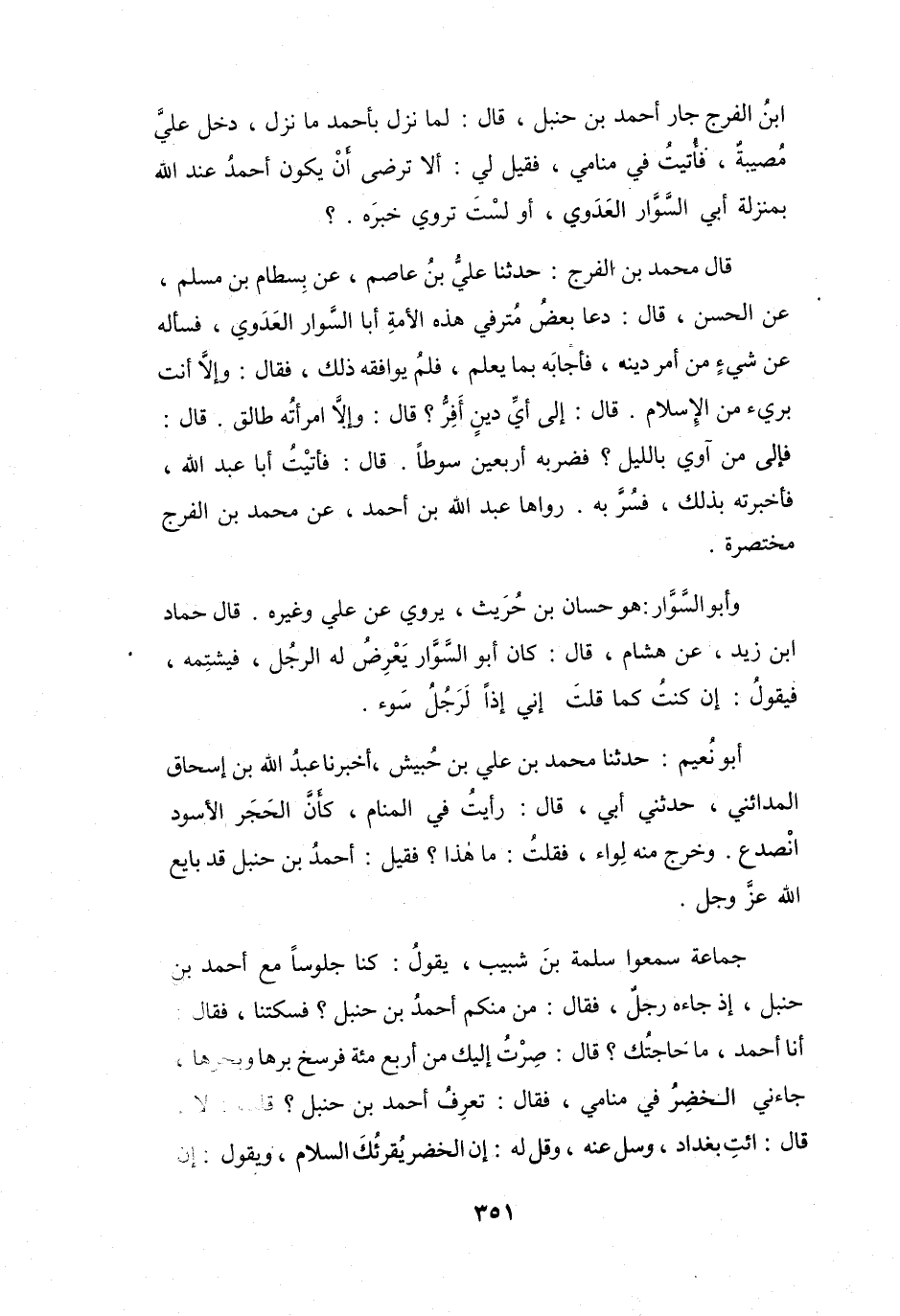 لَمَّا نَزَلَ بِأَحْمَدَ مَا نَزَلَ، دَخَلَ عَلَيَّ مُصِيبَةٌ، فَأُتِيتُ فِي مَنَامِي، فَقِيْلَ لِي: أَلاَ تَرضَى أَنْ يَكُوْنَ أَحْمَدُ عِنْدَ اللهِ بِمَنْزِلَةِ أَبِي السَّوَّارِ العَدَوِيِّ، أَوَ لَسْتَ تَروِي خَبَرَهُ؟