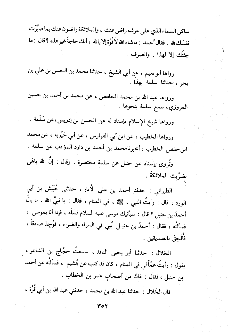رَأَيْتُ النَّبِيَّ -صَلَّى اللَّهُ عَلَيْهِ وَسَلَّمَ- فِي المَنَامِ، فَقَالَ: يَا نَبِيَّ اللهِ، مَا بَالُ أَحْمَدَ بنِ حَنْبَلٍ؟