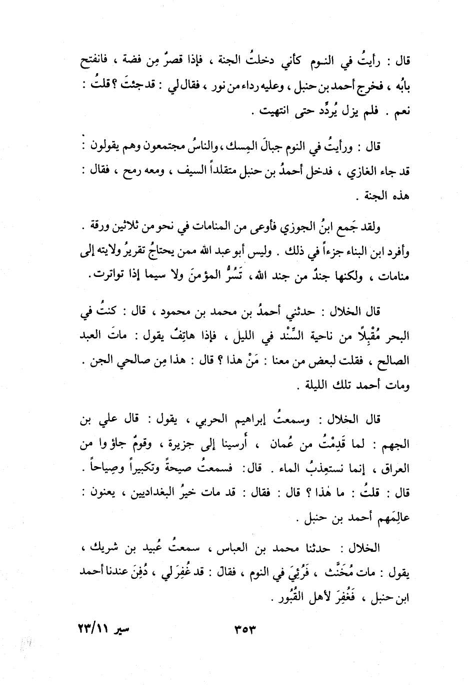 قَالَ: وَرَأَيْتُ فِي النَّوْمِ جِبَالَ المِسْكِ، وَالنَّاسُ مُجْتَمِعُوْنَ، وَهُم يَقُوْلُوْنَ: قَدْ جَاءَ الغَازِي، فَدَخَلَ أَحْمَدُ بنُ حَنْبَلٍ مُتَقَلِّداً السَّيْفَ، وَمَعَهُ رُمْحٌ، فَقَالَ: هَذِهِ الجَنَّةُ.