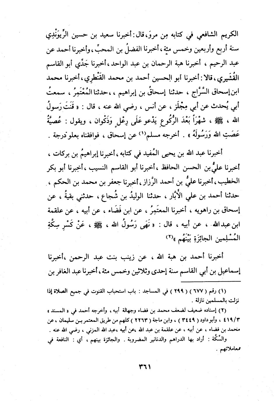 أَخْبَرَنَا عَبْدُ اللهِ بنُ يَحْيَى المُفِيْدُ فِي كِتَابِهِ، أَخْبَرَنَا إِبْرَاهِيْمُ بنُ بَرَكَاتٍ، أَخْبَرَنَا عَلِيُّ بنُ الحَسَنِ الحَافِظُ، أَخْبَرَنَا أَبُو القَاسِمِ النَّسِيْبُ، أَخْبَرَنَا أَبُو بَكْرٍ الخَطِيْبُ، أَخْبَرَنَا عَلِيُّ بنُ أَحْمَدَ الرَّزَّازُ، أَخْبَرَنَا جَعْفَرُ بنُ مُحَمَّدِ بنِ الحَكَمِ، حَدَّثَنَا أَحْمَدُ بنُ عَلِيٍّ الأَبَّارُ، حَدَّثَنَا الوَلِيْدُ بنُ شُجَاعٍ، حَدَّثَنِي بَقِيَّةُ، عَنْ إِسْحَاقَ بنِ رَاهْوَيْه، أَخْبَرَنَا المُعْتَمِرُ، عَنِ ابْنِ فَضَاءٍ، عَنِ أَبِيْهِ، عَنْ عَلْقَمَةَ بنِ عَبْدِ اللهِ، قَالَ: نَهَى رَسُوْلُ اللهِ -صَلَّى اللَّهُ عَلَيْهِ وَسَلَّمَ- عَنْ كَسْرِ سِكَّةِ المُسْلِمِيْنَ الجَائِزَةِ بَيْنَهُم (2) .