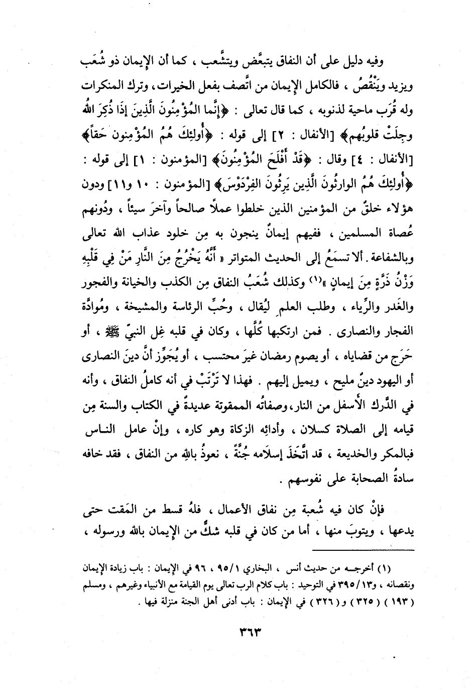وَفِيْهِ دَلِيلٌ عَلَى أَنَّ النِّفَاقَ يَتَبَعَّضُ وَيَتَشَعَّبُ، كَمَا أَنَّ الإِيْمَانَ ذُو شُعَبٍ، وَيَزِيْدُ وَيَنقُصُ، فَالكَامِلُ الإِيْمَانِ مَنِ اتَّصَفَ بِفِعْلِ الخَيْرَاتِ وَتَركِ المُنْكَرَاتِ، وَلَهُ قُرَبٌ مَاحِيَةٌ لِذُنُوبِهِ كَمَا قَالَ تَعَالَى: {إِنَّمَا المُؤْمِنُوْنَ الَّذِيْنَ إِذَا ذُكِرَ اللهُ وَجِلَتْ قُلُوْبُهُم} [الأَنْفَالُ: 2] ، إِلَى قَوْلِهِ: {أُوْلَئِكَ هُمُ المُؤْمِنُوْنَ حَقّاً} [الأَنْفَالُ: 4] ، وَقَالَ: {قَدْ أَفْلَحَ المُؤْمِنُوْنَ} [المُؤْمِنُوْنَ: 1] ، إِلَى قَوْلِهِ: {أُوْلَئِكَ هُمُ الوَارِثُونَ، الَّذِيْنَ يَرِثُوْنَ الفِرْدَوُسَ} [المُؤْمِنُوْنَ: 10 - 11] ، وَدُوْنَ هَؤُلاَءِ خَلقٌ مِنَ المُؤْمِنِيْنَ الَّذِيْنَ خَلَطُوا عَمَلاً صَالِحاً وَآخَرَ سَيِّئاً، وَدُوْنَهُم عُصَاةُ المُسْلِمِيْنَ، فَفِيْهِمْ إِيْمَانٌ يَنْجُوْنَ بِهِ مِنْ خُلُوْدِ عَذَابِ اللهِ -تَعَالَى- وَبِالشَّفَاعَةِ.