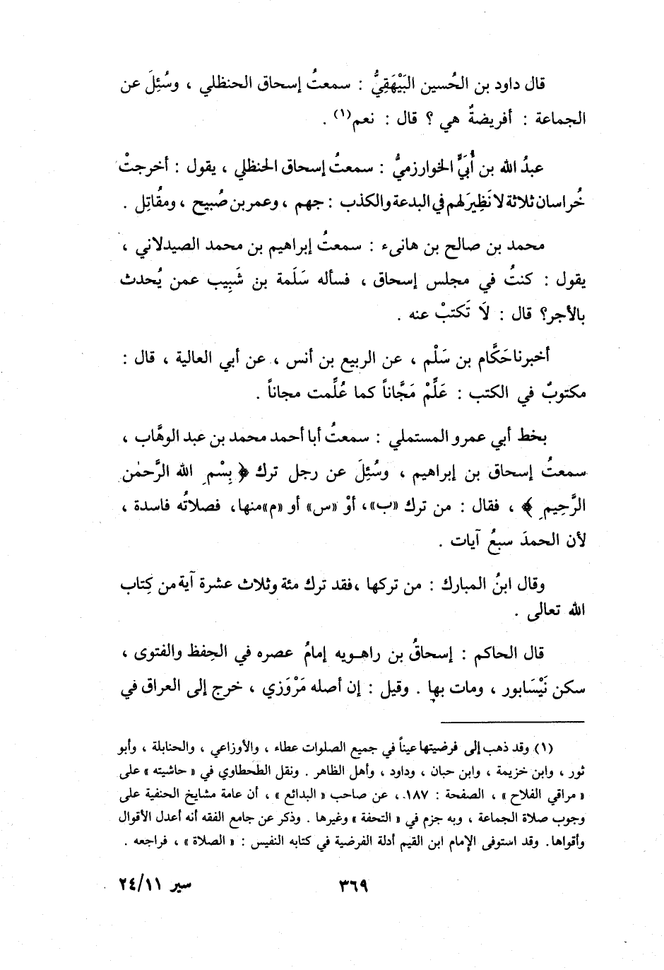 بِخَطِّ أَبِي عَمْرٍو المُسْتَمْلِي: سَمِعْتُ أَبَا أَحْمَدَ مُحَمَّدَ بنَ عَبْدِ الوَهَّابِ، سَمِعْتُ إِسْحَاقَ بنَ إِبْرَاهِيْمَ، وَسُئِلَ عَنْ رَجُلٍ تَرَكَ {بِسْمِ اللهِ الرَّحْمَنِ الرَّحِيْمِ} ، فَقَالَ: مَنْ تَرَكَ (ب) ، أَوْ (س) ، أَوْ (م) مِنْهَا، فَصَلاَتُه فَاسِدَةٌ، لأَنَّ الحَمْدَ سَبْعُ آيَاتٍ.
