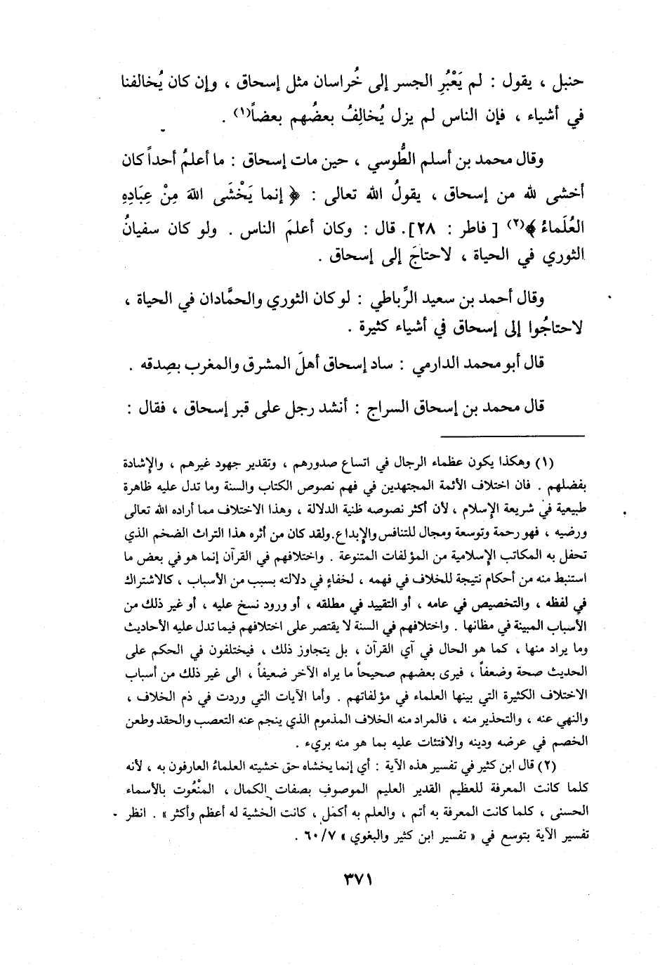 وَقَالَ مُحَمَّدُ بنُ أَسْلَمَ الطُّوْسِيُّ حِيْنَ مَاتَ إِسْحَاقُ: مَا أَعْلَمُ أَحَداً كَانَ أَخْشَى للهِ مِنْ إِسْحَاقَ، يَقُوْلُ اللهُ -تَعَالَى-: {إِنَّمَا يَخْشَى اللهَ مِنْ عِبَادِهِ العُلَمَاءُ (2) } [فَاطِرٌ: 28] .