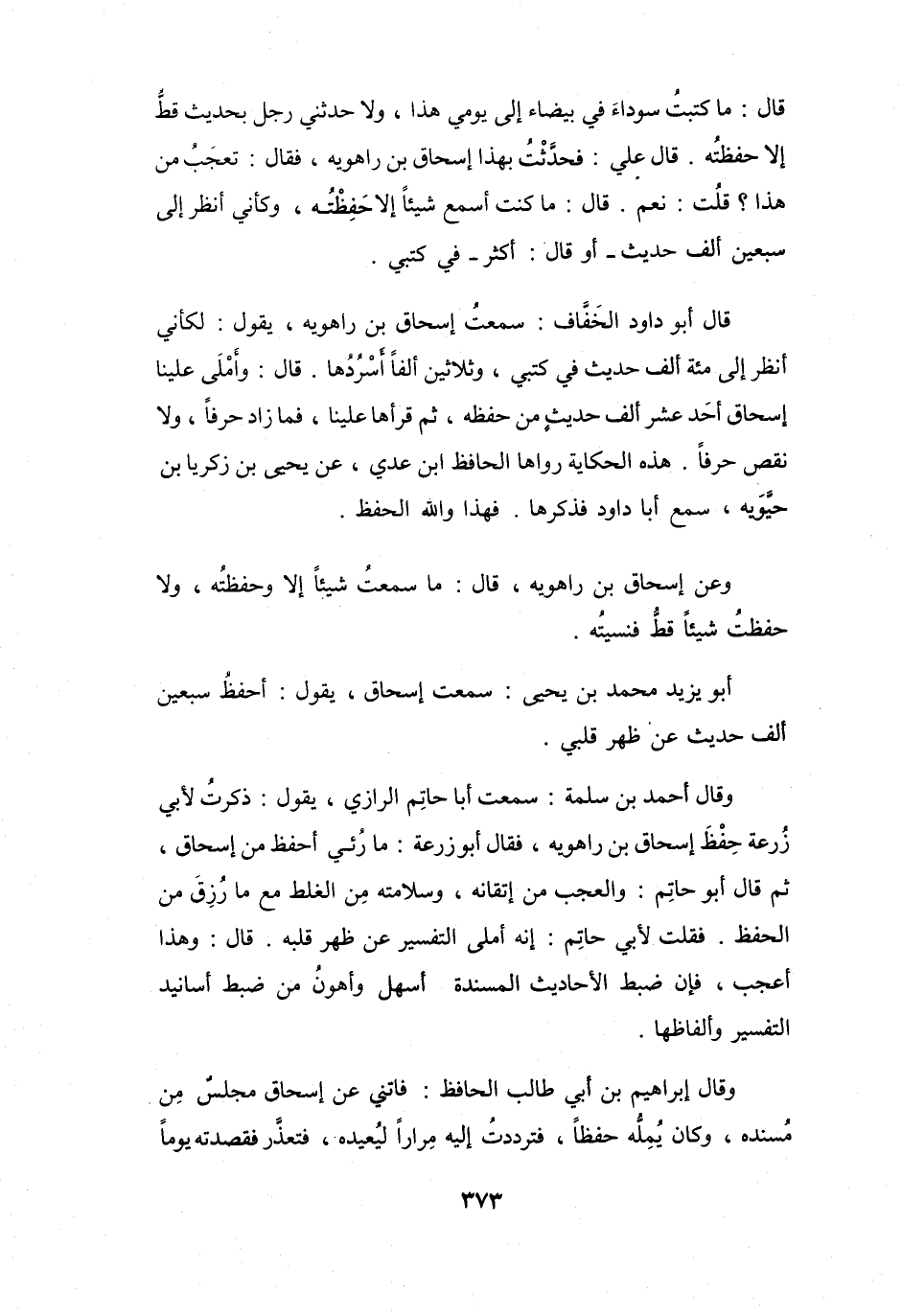 ذَكَرْتُ لأَبِي زُرْعَةَ حِفْظَ إِسْحَاقَ بنِ رَاهْوَيْه، فَقَالَ أَبُو زُرْعَةَ: مَا رُئِيَ أَحْفَظُ مِنْ إِسْحَاقَ.