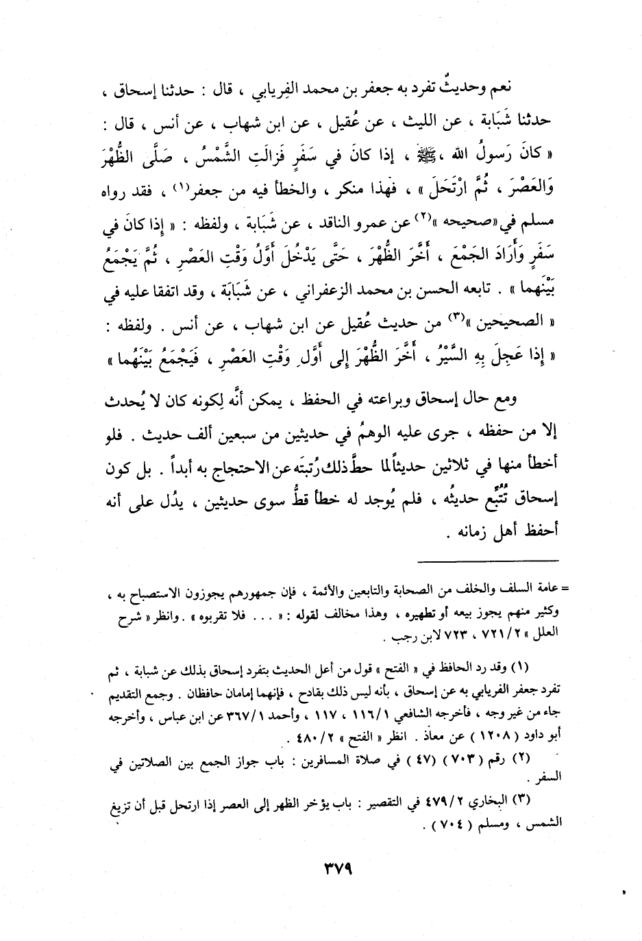 (1) وقد رد الحافظ في " الفتح " قول من أعل الحديث بتفرد إسحاق بذلك عن شبابة، ثم تفرد جعفر الفريابي به عن إسحاق، بأنه ليس ذلك بقادح، فإنهما إمامان حافظان.