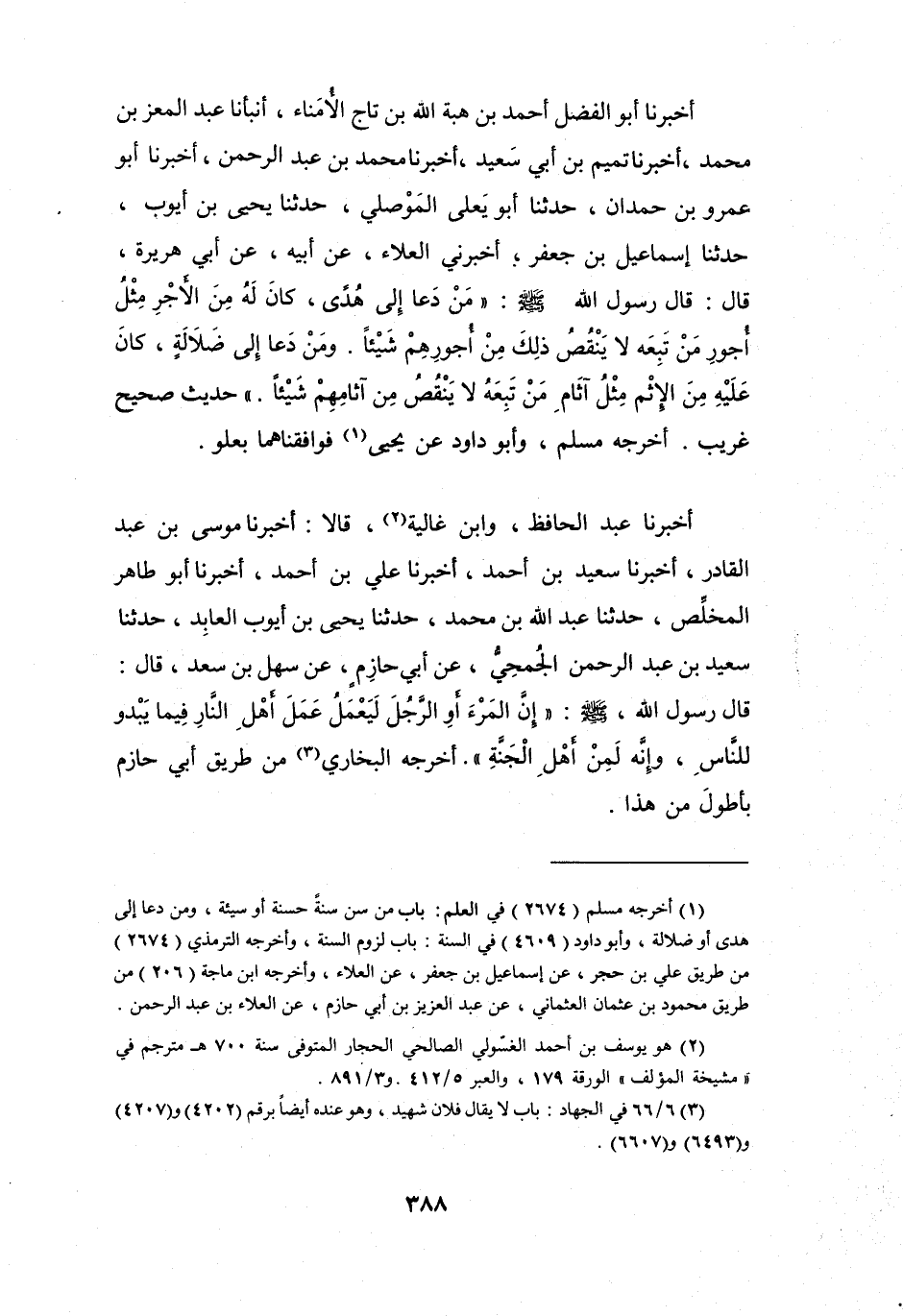 أَخْبَرَنَا أَبُو الفَضْلِ أَحْمَدُ بنُ هِبَةِ اللهِ بنِ تَاجِ الأُمَنَاءِ، أَنْبَأَنَا عَبْدُ المُعِزِّ بنُ مُحَمَّدٍ، أَخْبَرَنَا تَمِيْمُ بنُ أَبِي سَعِيْدٍ، أَخْبَرَنَا مُحَمَّدُ بنُ عَبْدِ الرَّحْمَنِ، أَخْبَرَنَا أَبُو عَمْرٍو بنُ حَمْدَانَ، حَدَّثَنَا أَبُو يَعْلَى المَوْصِلِيُّ، حَدَّثَنَا يَحْيَى بنُ أَيُّوْبَ، حَدَّثَنَا إِسْمَاعِيْلُ بنُ جَعْفَرٍ، أَخْبَرَنِي العَلاَءُ، عَنْ أَبِيْهِ، عَنْ أَبِي هُرَيْرَةَ، قَالَ: