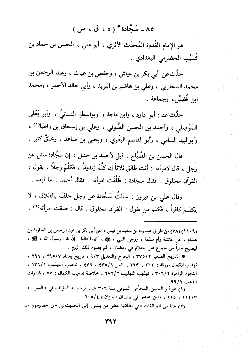 إِنَّ سَجَّادَةَ سُئِلَ عَنْ رَجُلٍ قَالَ لامْرَأَتِهِ: أَنْتِ طَالِقٌ ثَلاَثاً إِنْ كَلَّمَ زِنْدِيْقاً، فَكَلَّمَ رَجُلاً يَقُوْلُ: القُرْآنُ مَخْلُوْقٌ؟