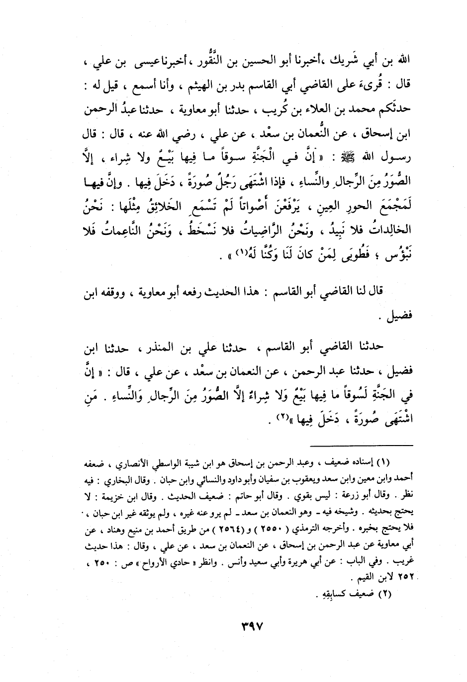 (إِنَّ فِي الجَنَّةِ لَسُوْقاً مَا فِيْهَا بَيْعٌ وَلاَ شِرَاءٌ إِلاَّ الصُّوَرُ مِنَ الرِّجَالِ وَالنِّسَاءِ، مَنِ اشْتَهَى صُوْرَةً، دَخَلَ فِيْهَا) (2) .